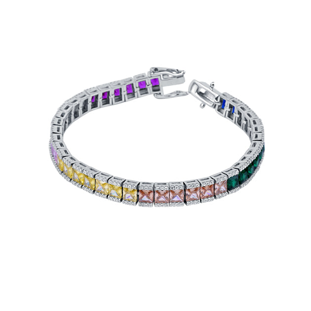 This Colorful Splash Sterling Silver Tennis Bracelet for women is a chic addition to any wardrobe. Expertly crafted from sterling silver and adorned with colorful zirconia, this timeless piece is complete with a rhodium finish for an extra glimmer. Perfect for day-to-night wear, its minimal design is a subtle statement worth flaunting.