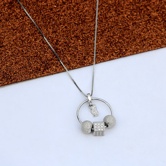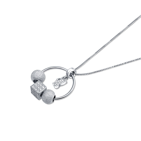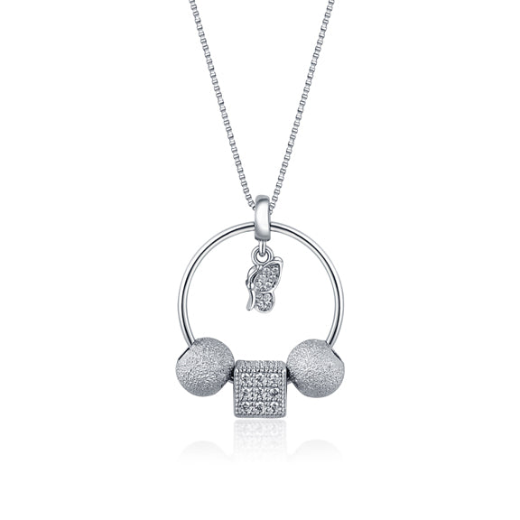 This exquisite sterling silver pendant and chain set is plated finished in rhodium features a ring with silver beads and a stunning zirconia-studded cube bead. Inside the ring hangs a butterfly with a zirconia studded center, adding an extra touch of elegance to the piece. The whole design is simply stunning and would be perfect for everyday wear or for dressing up on special occasions. It also makes for an excellent gift idea
