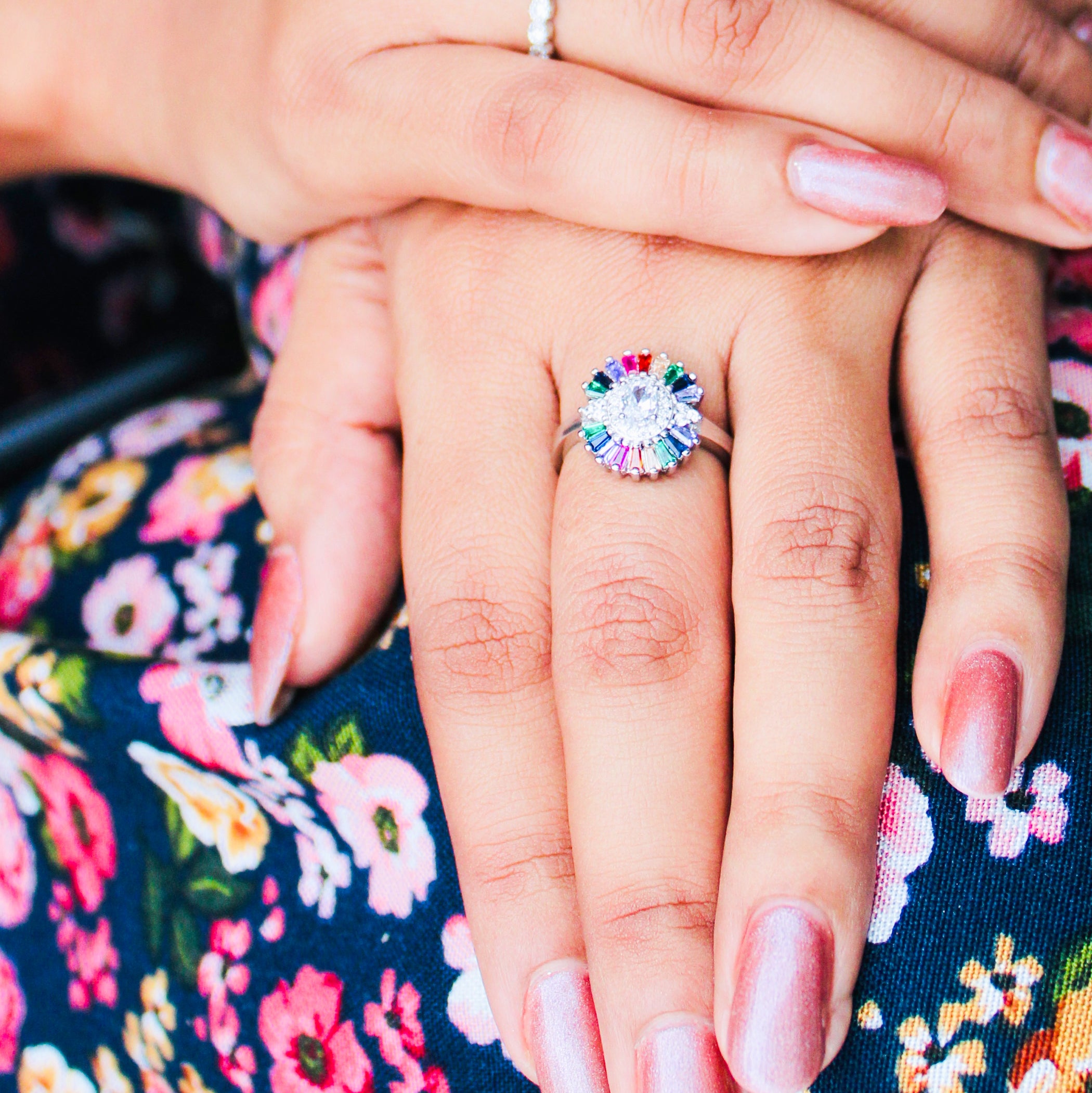 This Dancing Rainbow Ring is a sparkling touch of sophistication crafted from premium 925 sterling silver. The minimalist design is infused with a hint of color and style, perfect for adding a hint of drama to an understated look. Whether you choose to wear it solo or stack it with other rings, this chic piece of everyday jewelry is sure to make a statement.