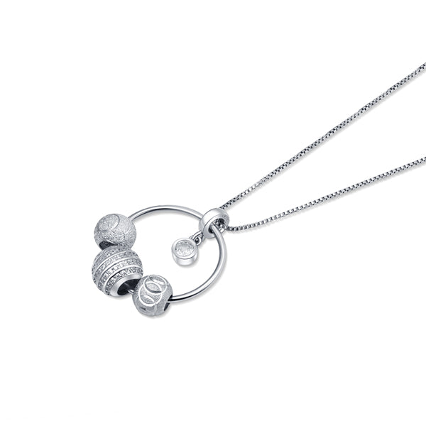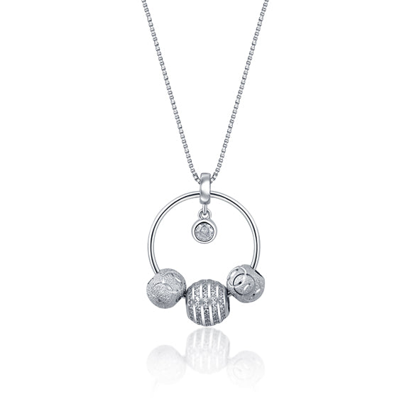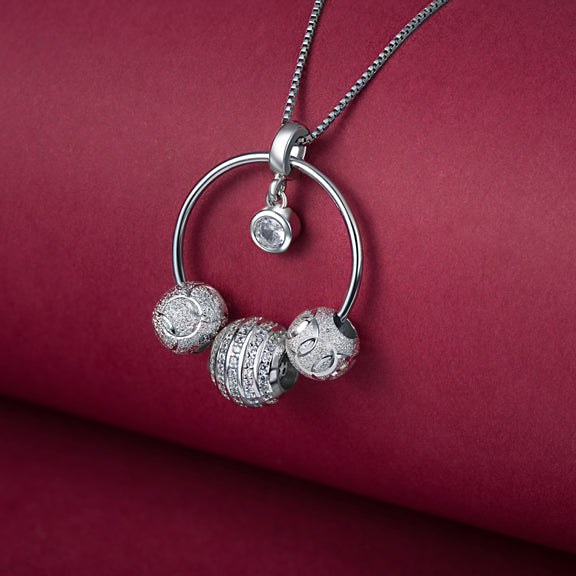 This exquisite sterling silver pendant and chain set is plated finished in rhodium features a ring with silver beads and a stunning zirconia-studded cube bead. Inside the ring hangs a a zirconia in round shape, adding an extra touch of elegance to the piece. The whole design is simply stunning and would be perfect for everyday wear or for dressing up on special occasions. It also makes for an excellent gift idea