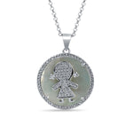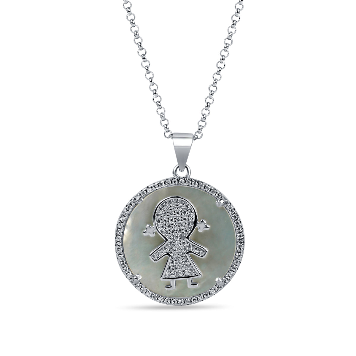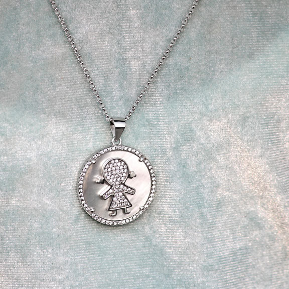 Introducing Dolly 925 Sterling Silver Pendant and Chain Set. Made of premium 925 sterling silver, this set features a beautiful girl in the center with sparkling zirconia and mother of pearl accents. Complete with a rhodium finish for a luxurious touch. Elevate your style with this exquisite set.