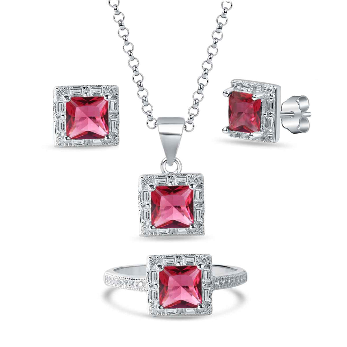 Indulge in luxury with our Red Treasure Box 925 Sterling Silver 3-piece set. Featuring a stunning red square motif embedded with zirconia, this set includes a ring, pendant, and earring studs. With a rhodium finish, it exudes elegance and is perfect for any party. Give the gift of sophistication with this exclusive set. (Chain not included.)