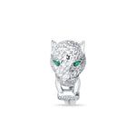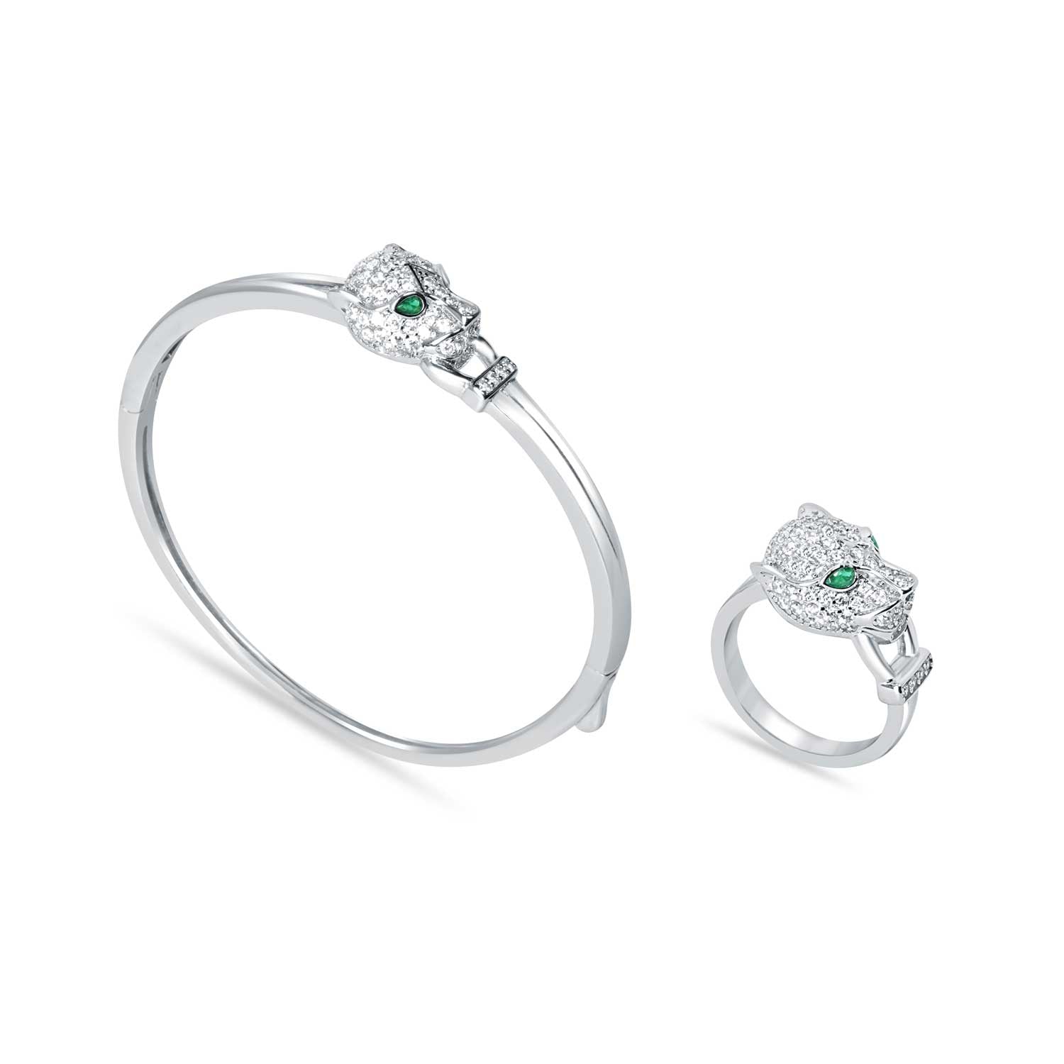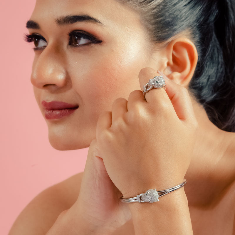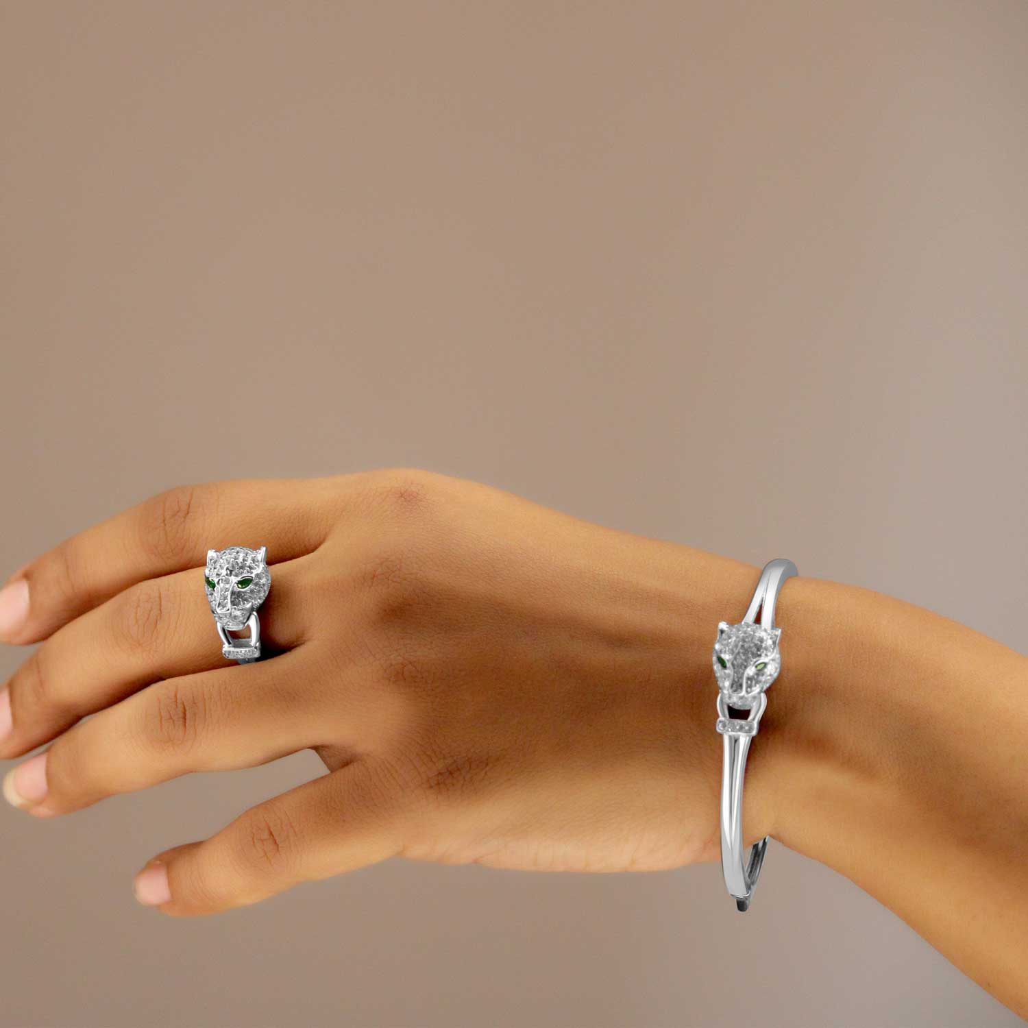 Add a touch of wildness to your jewelry collection with our Silver Jaguar Set! Featuring a playful jaguar design, this set includes a Kada and a matching ring, both studded with sparkling zirconia stones. And with a sleek rhodium finish, it's a beautiful, fun addition to any outfit.