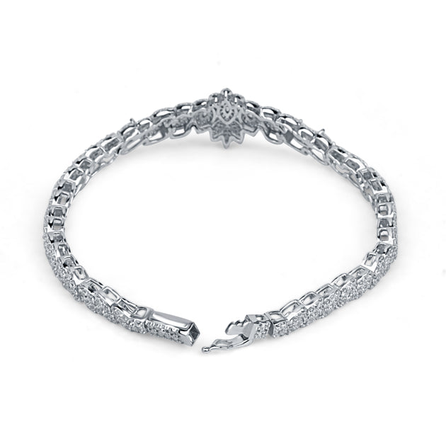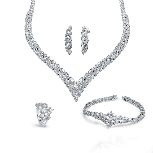 Enchant and mesmerize with Simmery Petals' exclusive sterling silver 4-piece set, perfect for adding a touch of elegance to any look. Each piece of jewelry holds the finest zirconias for a unique sparkle, and is finished with a rhodium coating for a timeless appeal. Perfect for special occasions, this stylish set is a unique gift for women who appreciate the finer luxuries. The set includes a necklace, bracelet and ring and earring, making it a complete and sophisticated look.