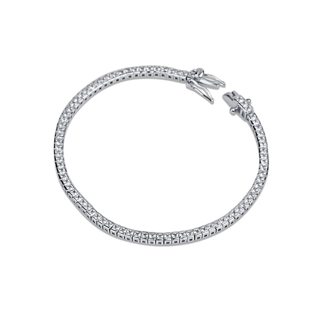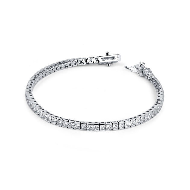This sparkling silver tennis bracelet from Sparkling Moments will have you looking sleek and sophisticated at any event. Created with sterling silver and a rhodium finish, this bracelet is adorned with zirconia stones for a luxurious look. It's perfect for wearing during the day or dressing up for a special night out.