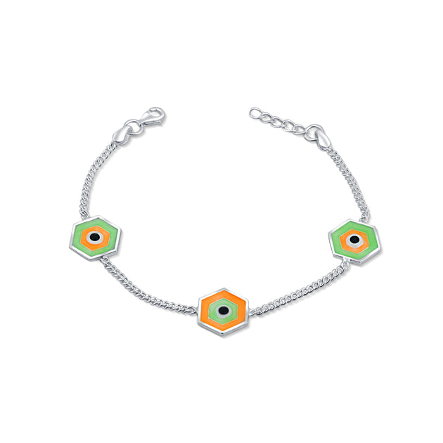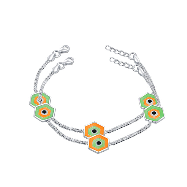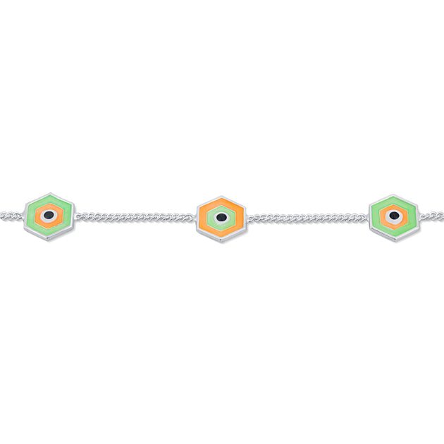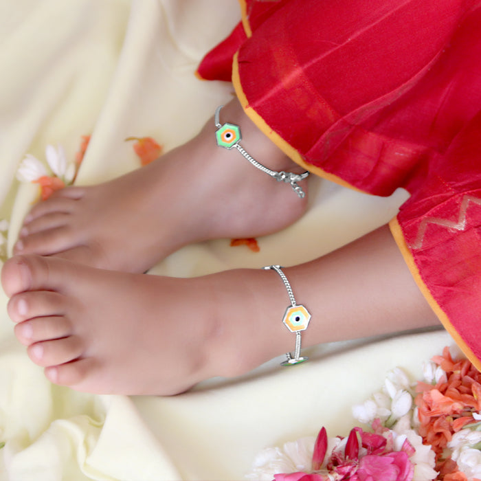 Our Fun Hexa Silver Baby Anklets is a cute pair of silver anklets for babies full of happiness vibe. In vibrant shades of saffron orange and cadmium green, with a black protection Chi dot in the centre, the Fun Hexa Silver Anklets for babies is made of 92.5 Sterling Silver with a fish lock secure closure. The luxurious silver finish adds to the charm. Hexagon embodies harmony and balance. In feng shui hexagon is used to create the energy of good health and long life. Usher in good vibes with our Fun Hexa Silver Anklets for babies.