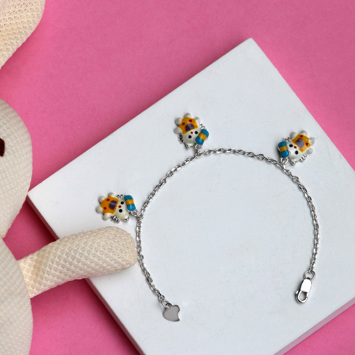 Experience luxury and comfort with our Yellow Dress Kitty Charms Sterling Silver Bracelet for Babies. Made with Sterling silver, this bracelet is comfortable for babies aged 1.5 to 2 years. Adorned with precious enamel-finished hello kitty charms, it's the perfect gift for your little one. Its silver finish adds a touch of elegance.