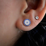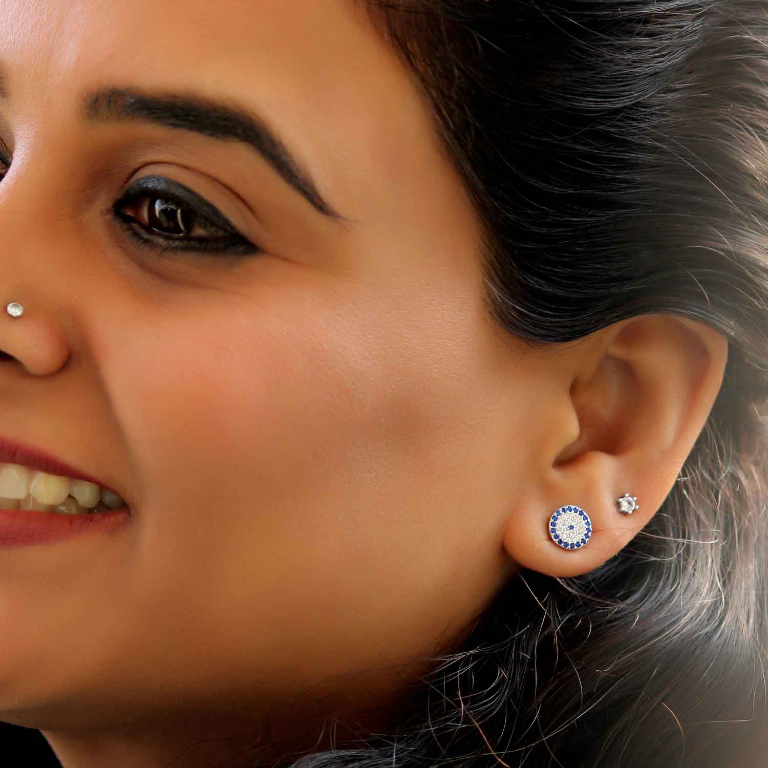 Our Glittery Flora Sterling Silver Studs for Women feature a beautiful blend of sterling silver, blue, and white zirconia for an elegant, everyday look. Expertly crafted with a floral shape and sparkling accents, these studs bring a touch of luxury and timeless beauty to any ensemble.