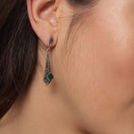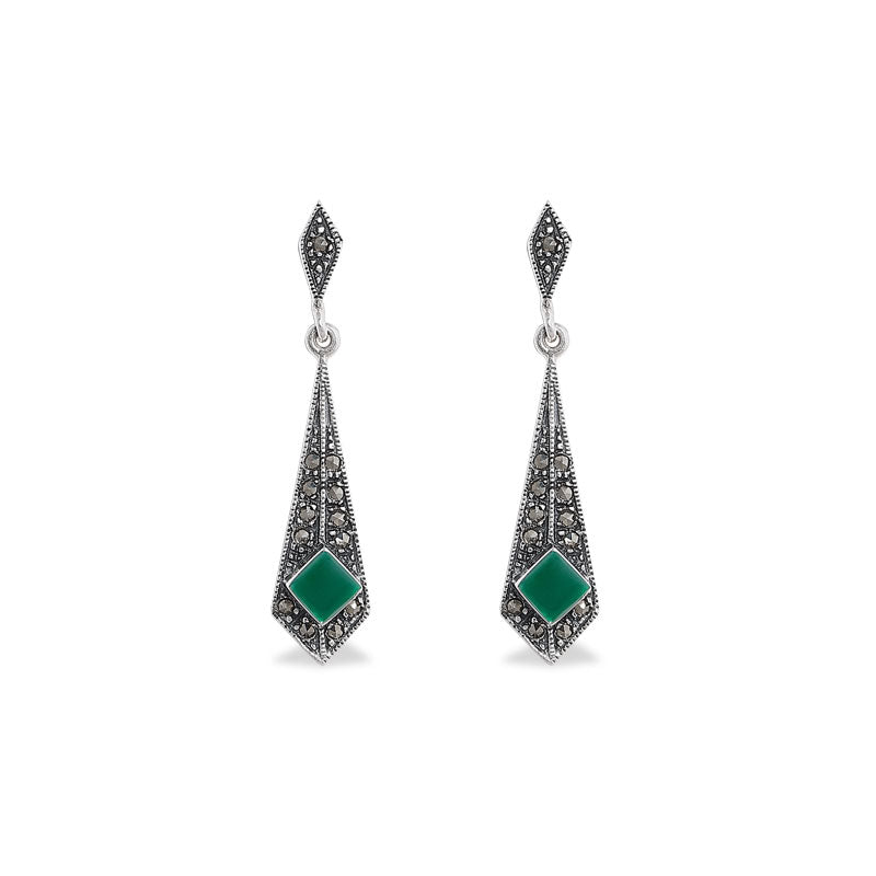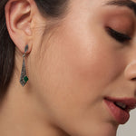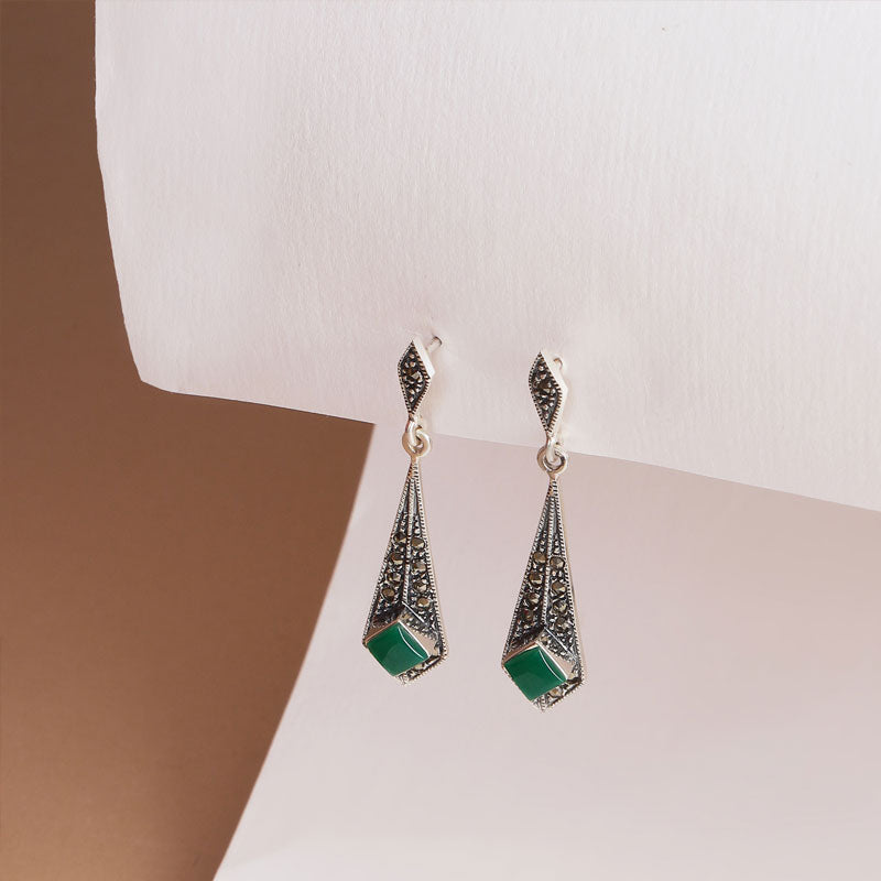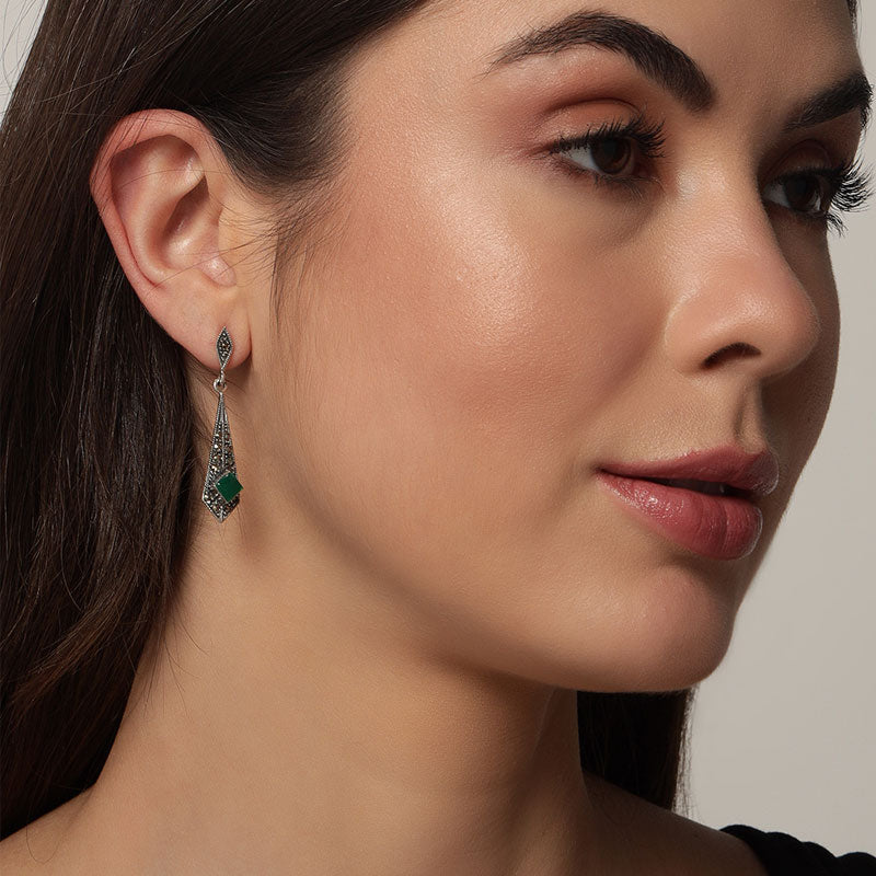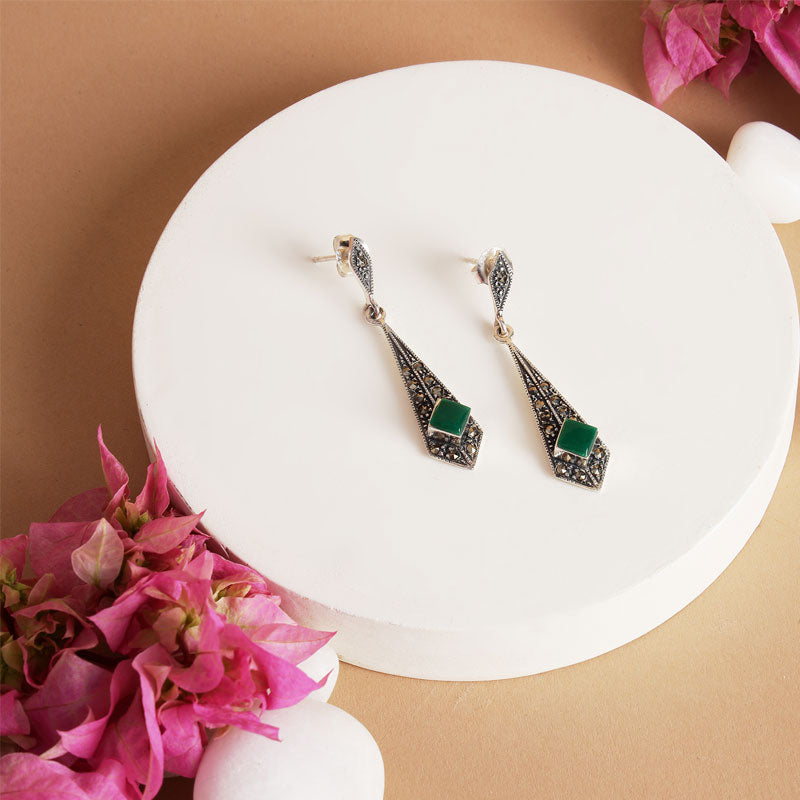Elegant with a vintage soul, these Dangler Earrings for women feature a striking combination of sparkling marcasite and deep green onyx semi-precious stones. The intricate oxidised finish adds a timeless, antique charm, beautifully complementing the rich hues of the stones. Known for its grounding and protective properties, green onyx brings a sense of balance and calm, while marcasite adds subtle shimmer and character. Lightweight yet impactful, these earrings are perfect for both festive occasions and everyday sophistication — a graceful blend of tradition and statement style.