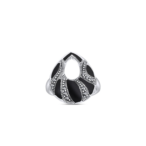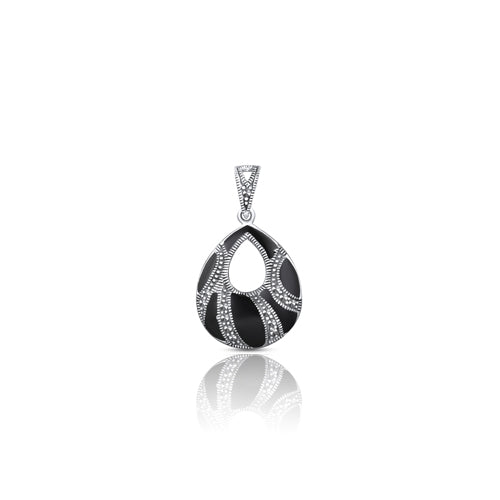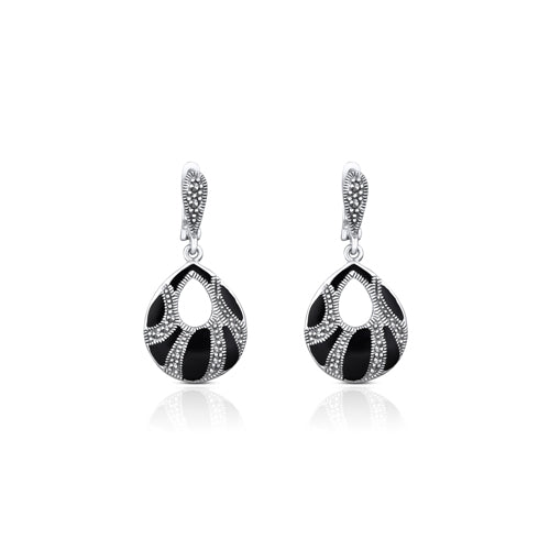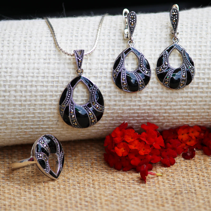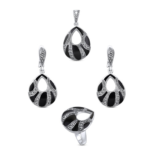 This drop-shaped three-piece set for women is crafted to be worn and loved for a lifetime. Refined and elegant, this set includes a pair of dangler earrings, a ring, and a pendant. Made from 92.5 sterling, each piece of this set is finished with Black enamel and marcasite. This set will create an eclectic yet modern look.