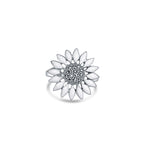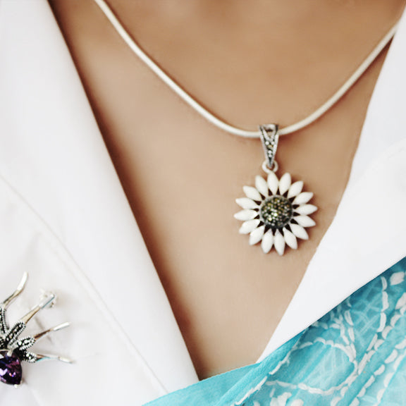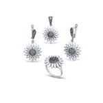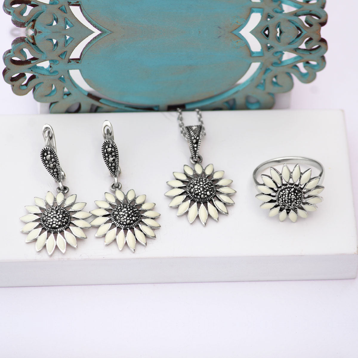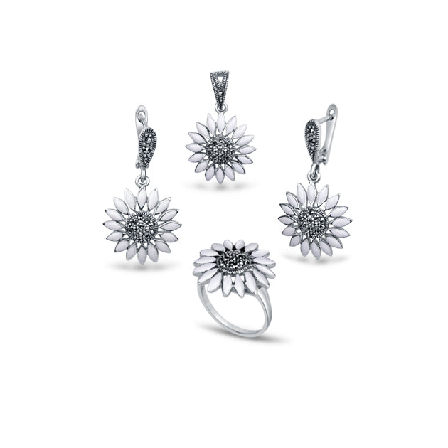 This sterling silver three-piece set with white enamel will compliment your style and uplifts your attire effortlessly. The pendant, dangler earrings, and ring feature flower motifs embellished with marcasite stones and white enamel. Each piece is finished with an oxidised plated setting.