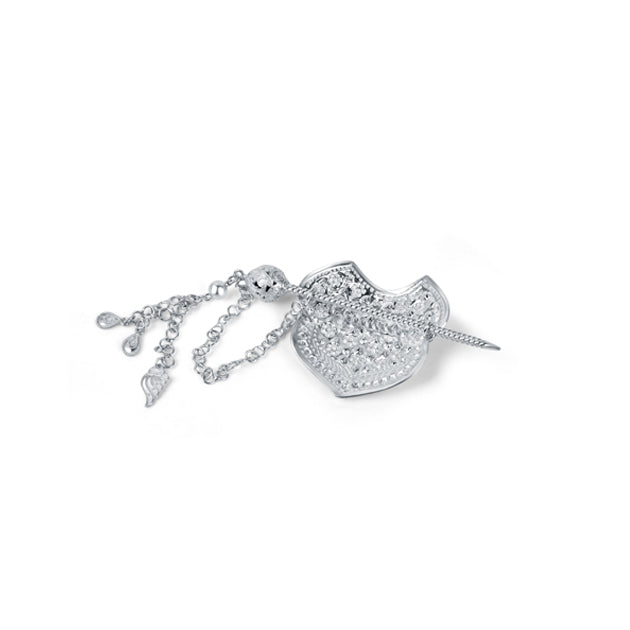 Juda Pin is an integral part of Indian fashion and the Ethnic Indian look. Our Ramya Silver Juda Pin for Women is a beautifully crafted ornate silver hair clip with a silver chain tassel. Made in 92.5 Sterling Silver with a classy Matt finish, the Juda Pin has a royal look to it. A beautiful Juda Pin or hair clip adds glamour to the hairstyle and makes the simplest of hairdos look special. When styling an ensemble, it is very important to create those little details that complete the look. Our exquisite Ramya Silver Juda Pin is the classy ethnic detail that adds sparkle and a festive glamour to your beautiful ethnic look.