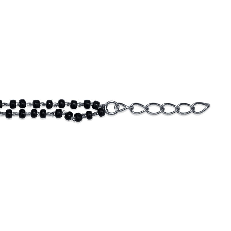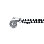 The centerpiece is attached to a double string of black beads, joined with sleek rhodium-finish links, blending the sacred essence of the Mangalsutra with contemporary minimal style.