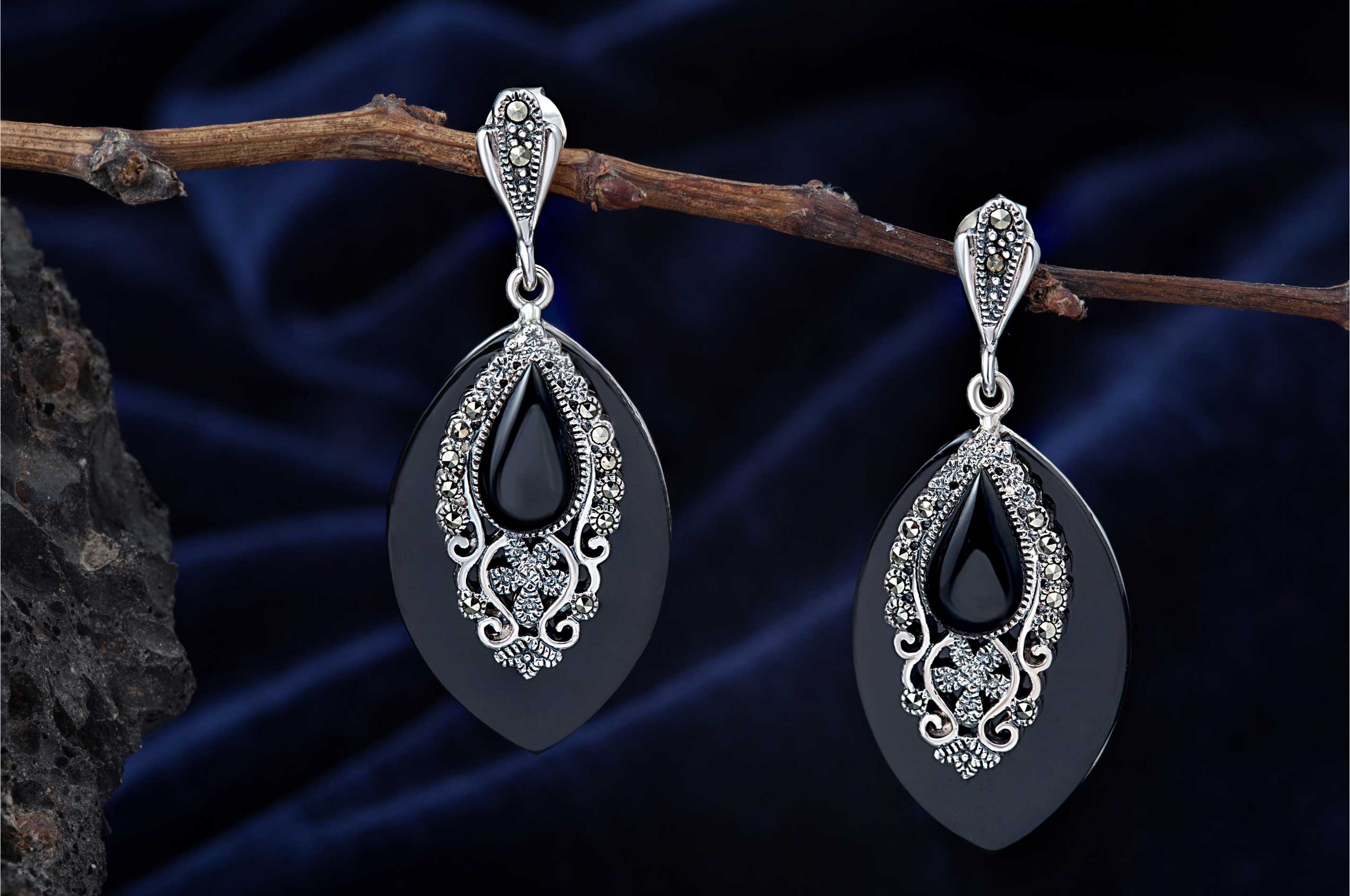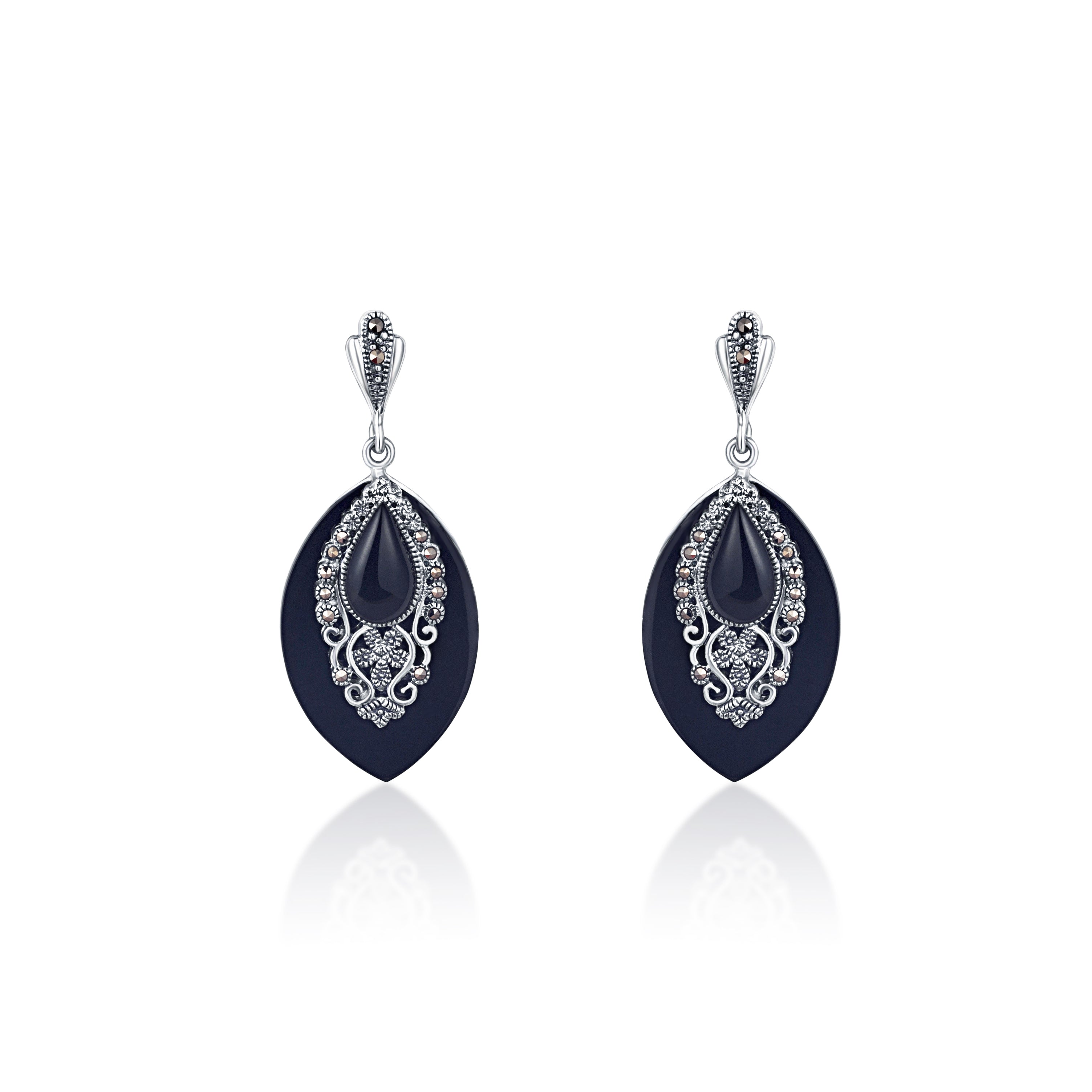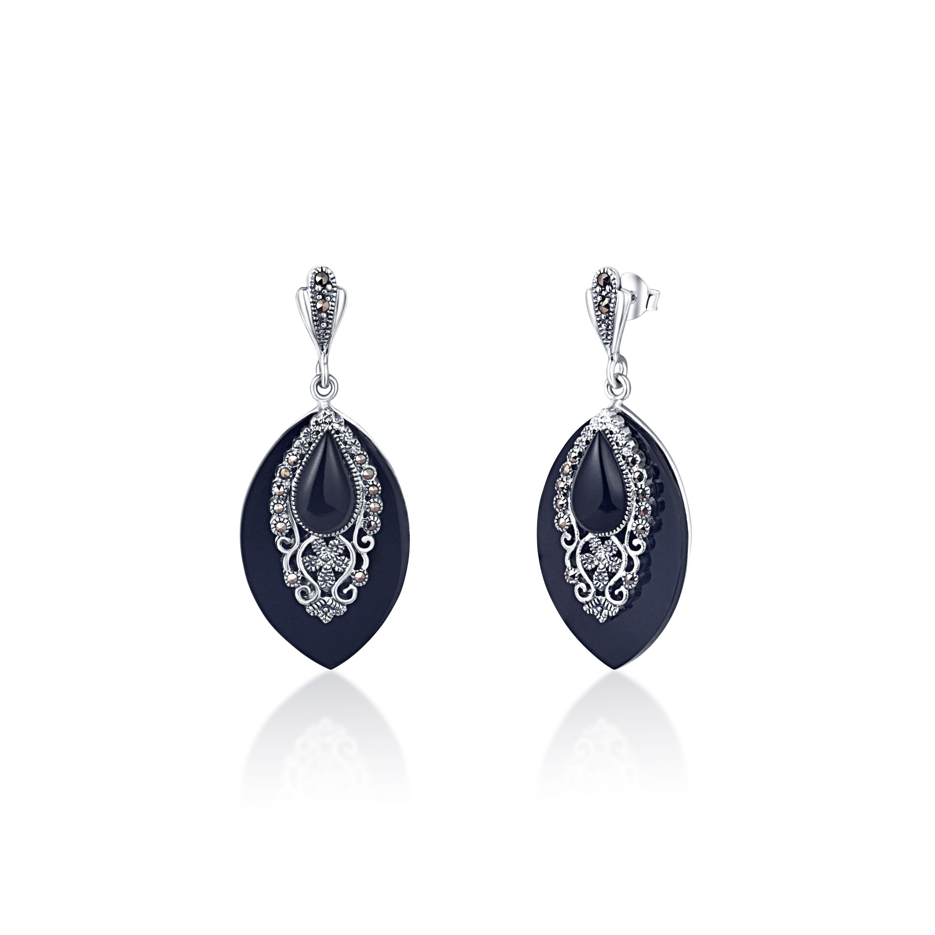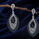 The beautiful drop and the trendy color black, are inspired by your vivid personality of you. As charming as drop and as quit as dew, this dangler is something that will define you. As gleaming as the beam in the dark, crafted of black onyx and embellished with a marquise at the top. Handcrafted with the 92.5 sterling silver with a push-back closure and oxidized finish. Embrace the dangler and charm the world.