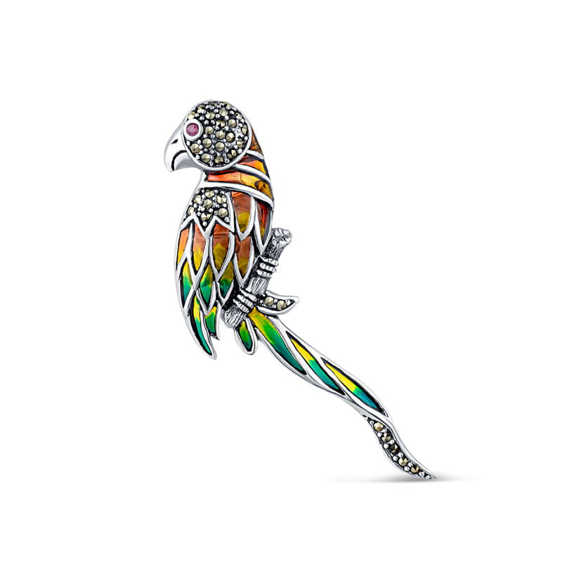 Adding a touch of elegance and femininity to your outfit is easy with this beautiful brooch. Crafted from 925 sterling silver, it features parrot with oxidised finish, embelished marcasite and colourful enamel detailing. The parrot symbolises freedom and vitality, making this the perfect piece to inject a bit of personality into your look.