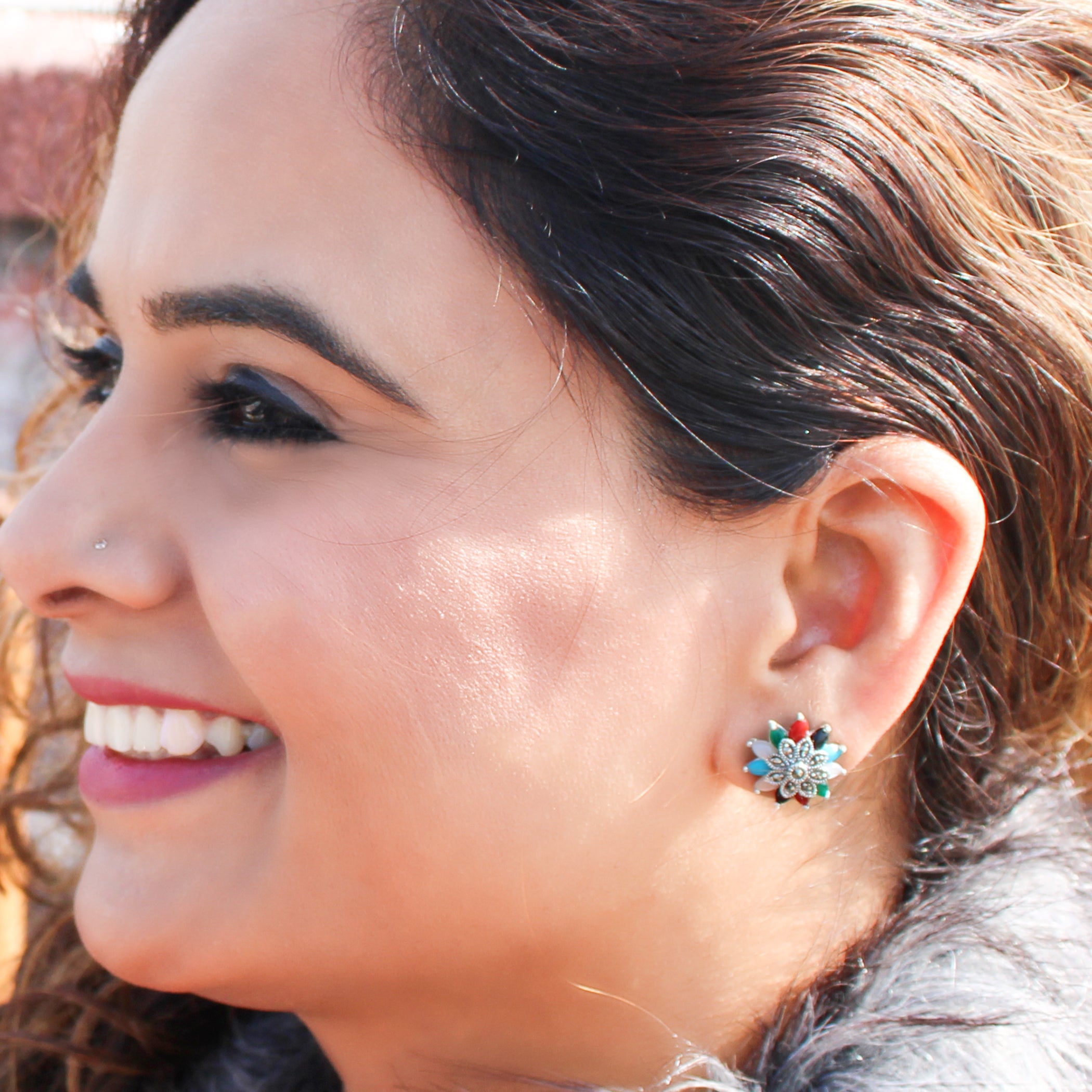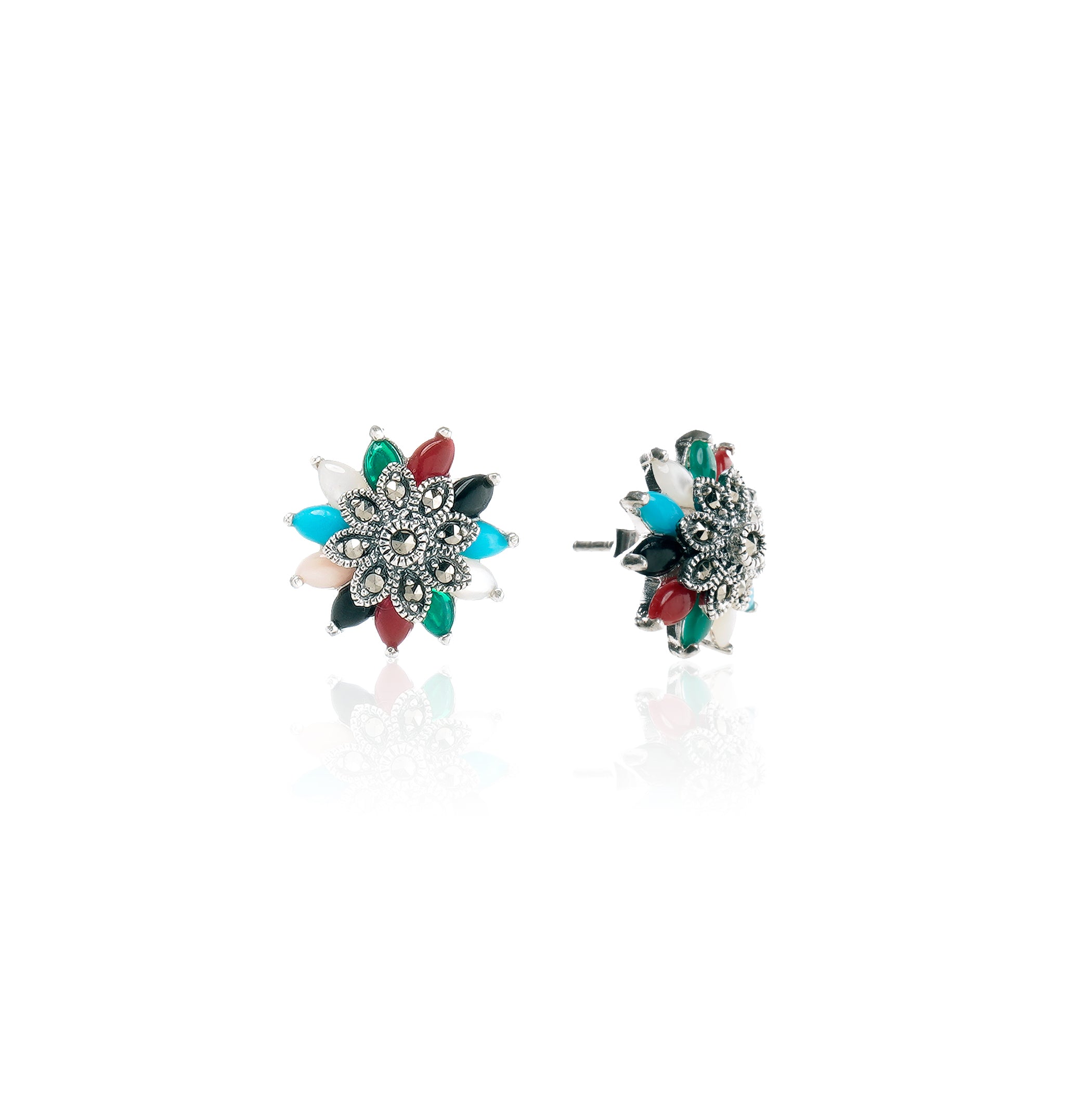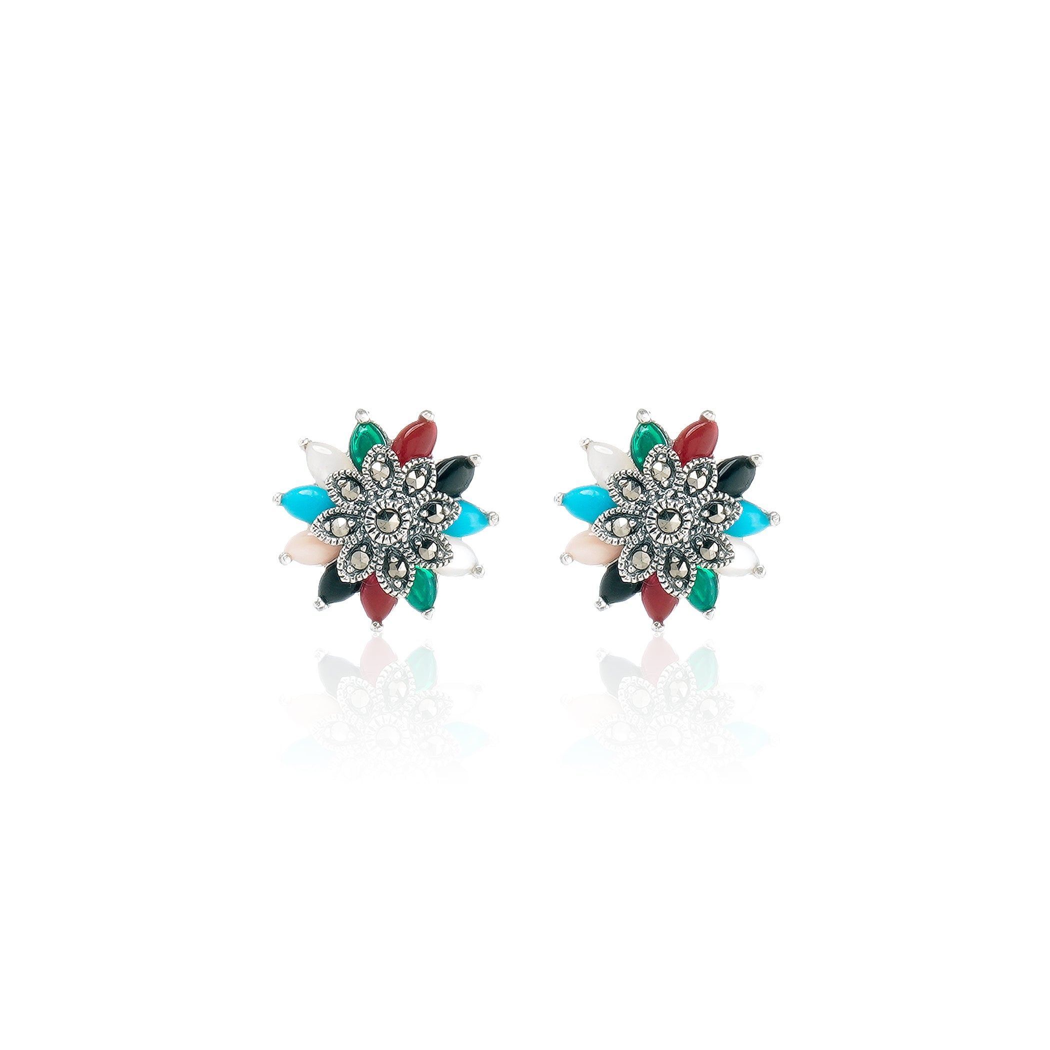 Add the perfect finish to any outfit with this gorgeous colorful pair of stud earrings. Crafted in 92.5 sterling silver and finished in oxidized, this pair of stud earrings, a colorful interpretation inspired by nature,  feature flowers embellished with colorful stones in petals and a little marcasite flower in the middle.