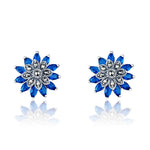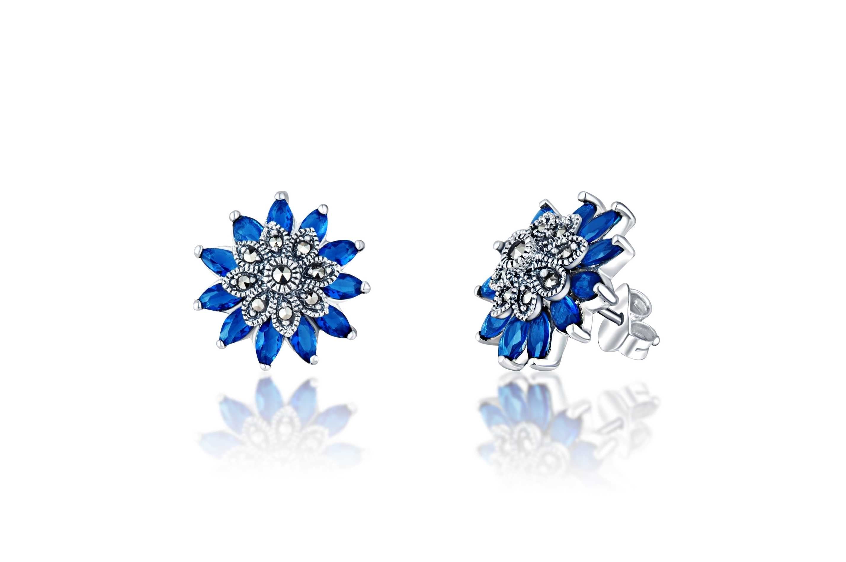 Add the perfect finish to any outfit with this gorgeous Blue Sapphire pair of stud earrings. Crafted in 92.5 sterling silver and finished in oxidized, this pair of stud earrings, a blue interpretation inspired by nature,  feature flowers embellished with Blue Sapphire stones in petals and a little marcasite flower in the middle.