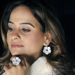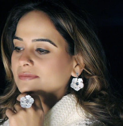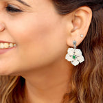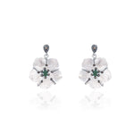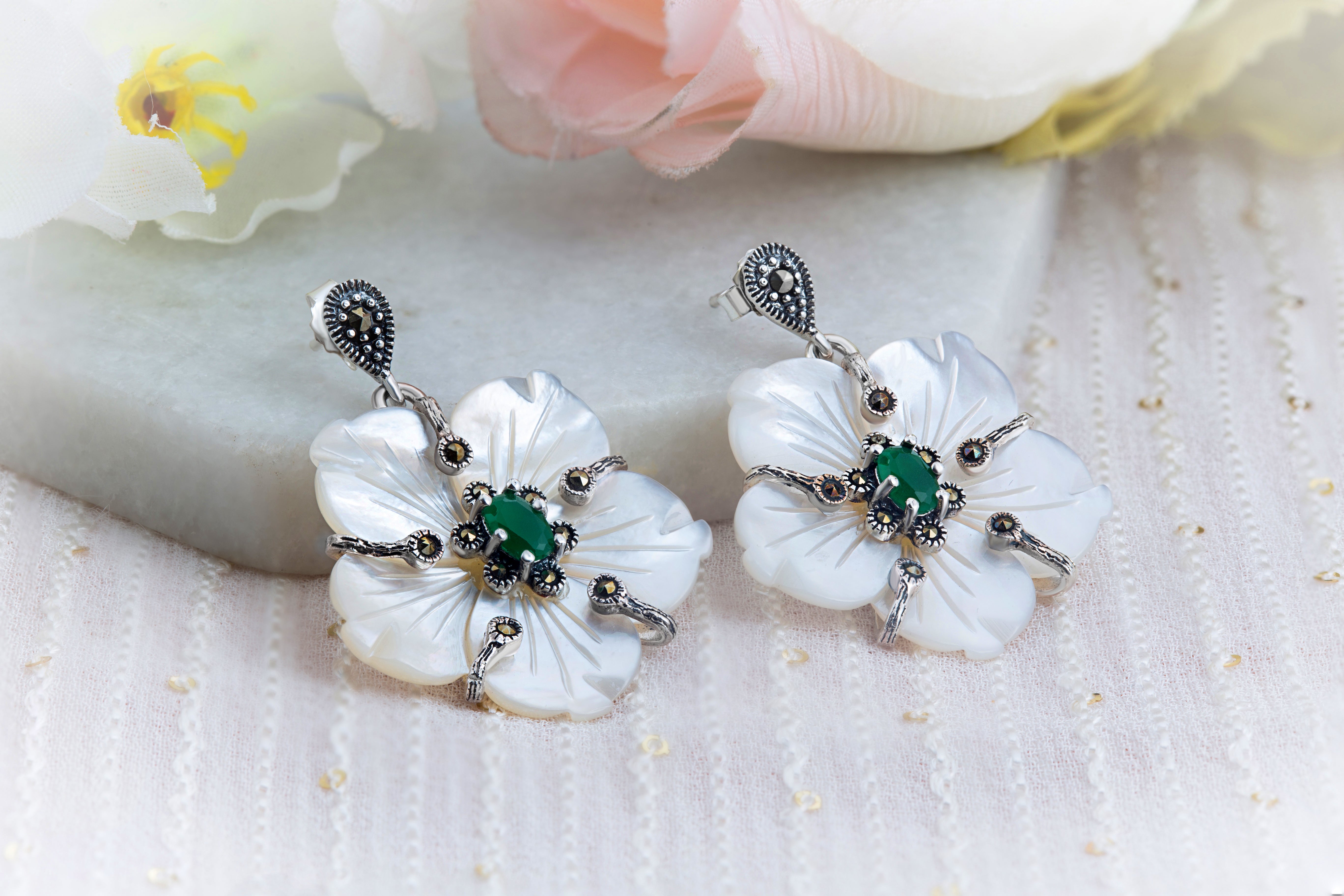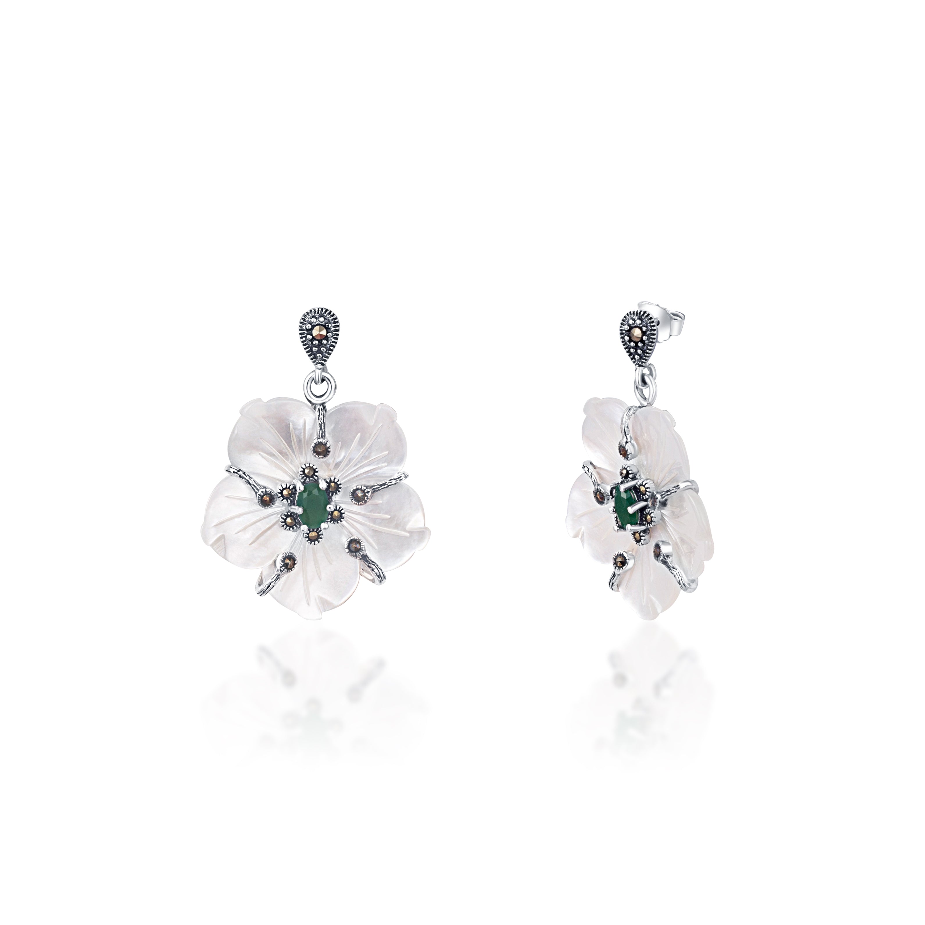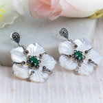 Flowers make everything joyful, charming, and pleasant. Our interpretation of flowers as a token of happiness with the charm. A beautiful bloomed flower is handcrafted with 92.5 sterling silver and has evergreen emerald in the core. Add a piece of the moon with the details added by the marcasite on the mother of pearl petals. The push-back closure and oxidized sheen make it simple to put on. Embrace the beautiful dangler and shine!