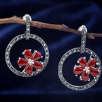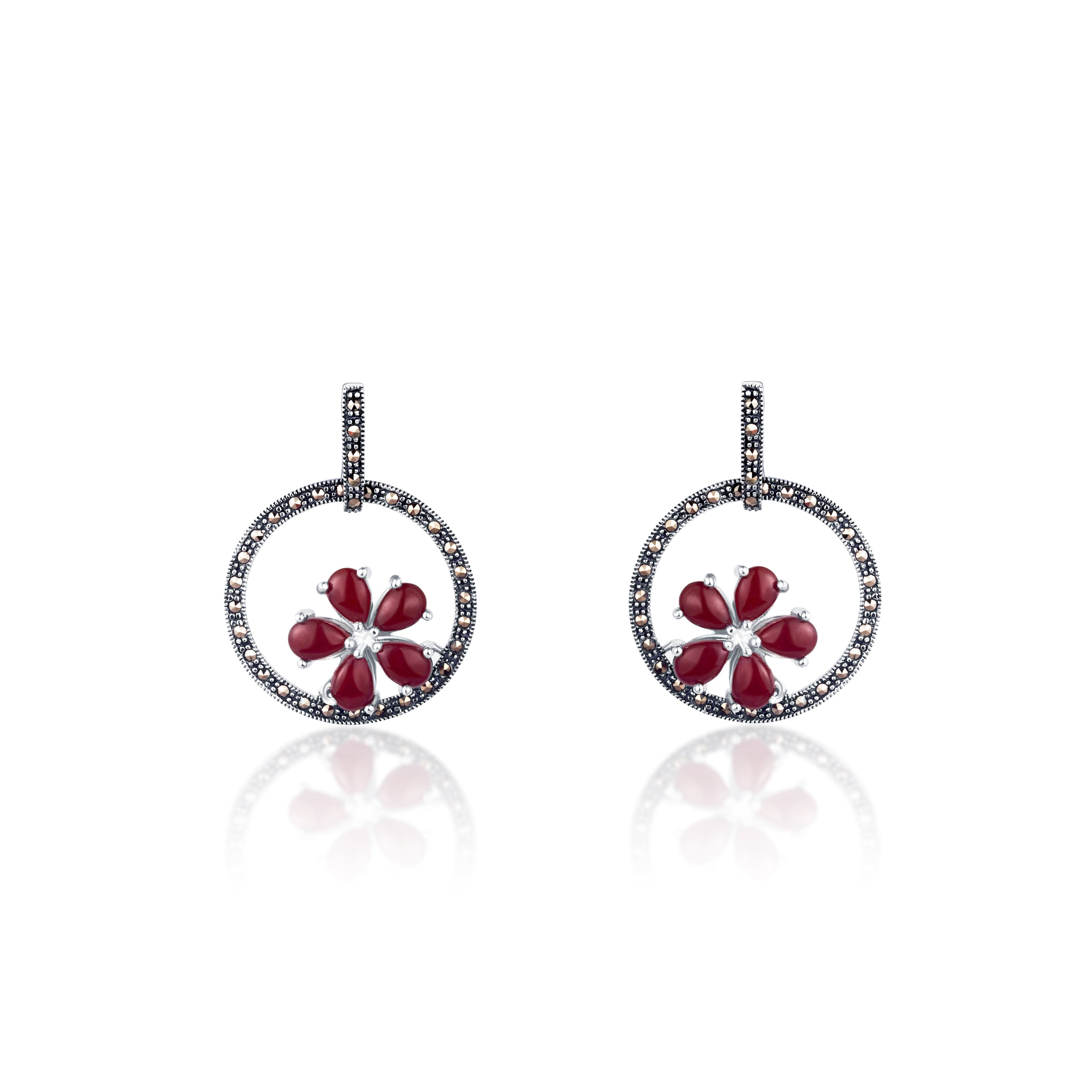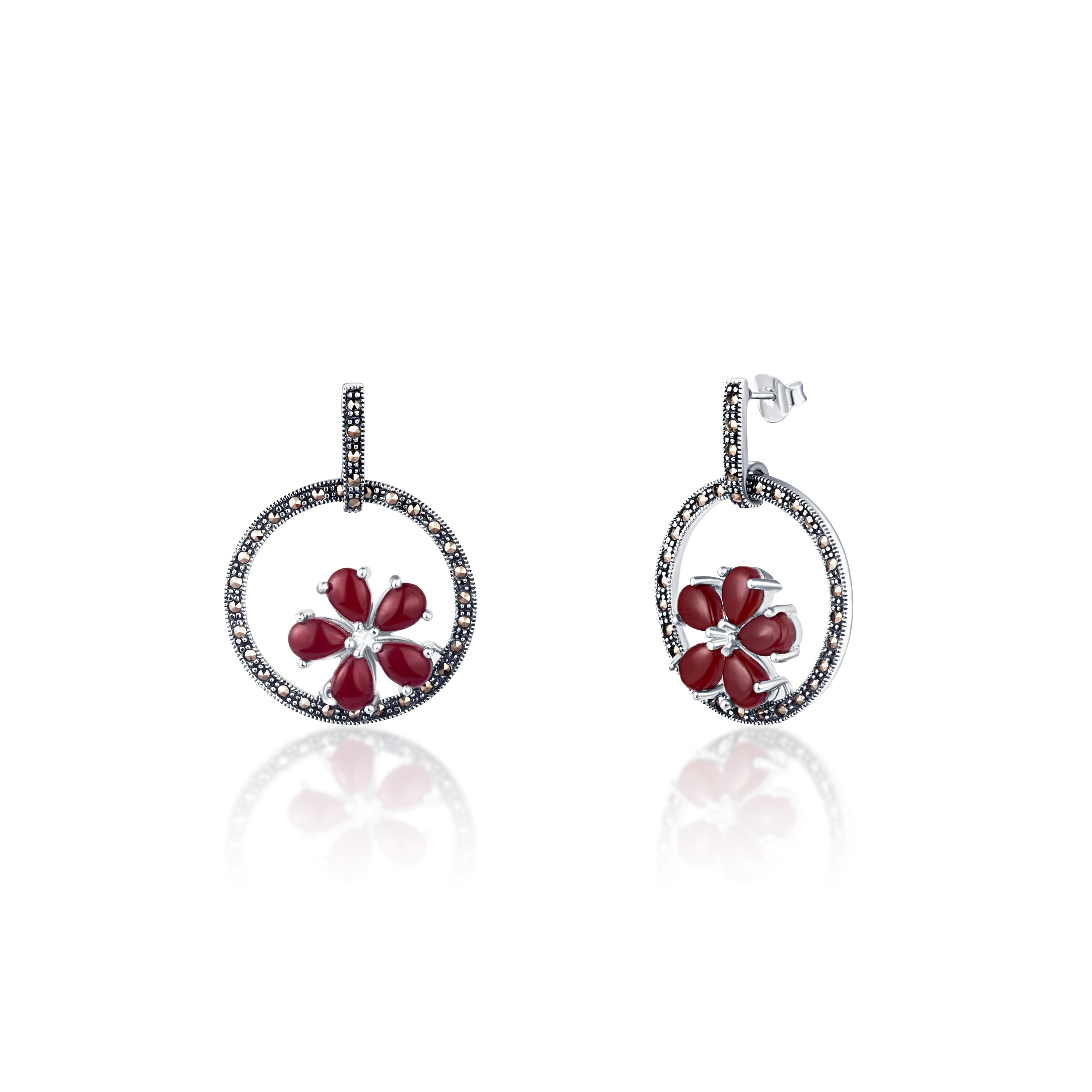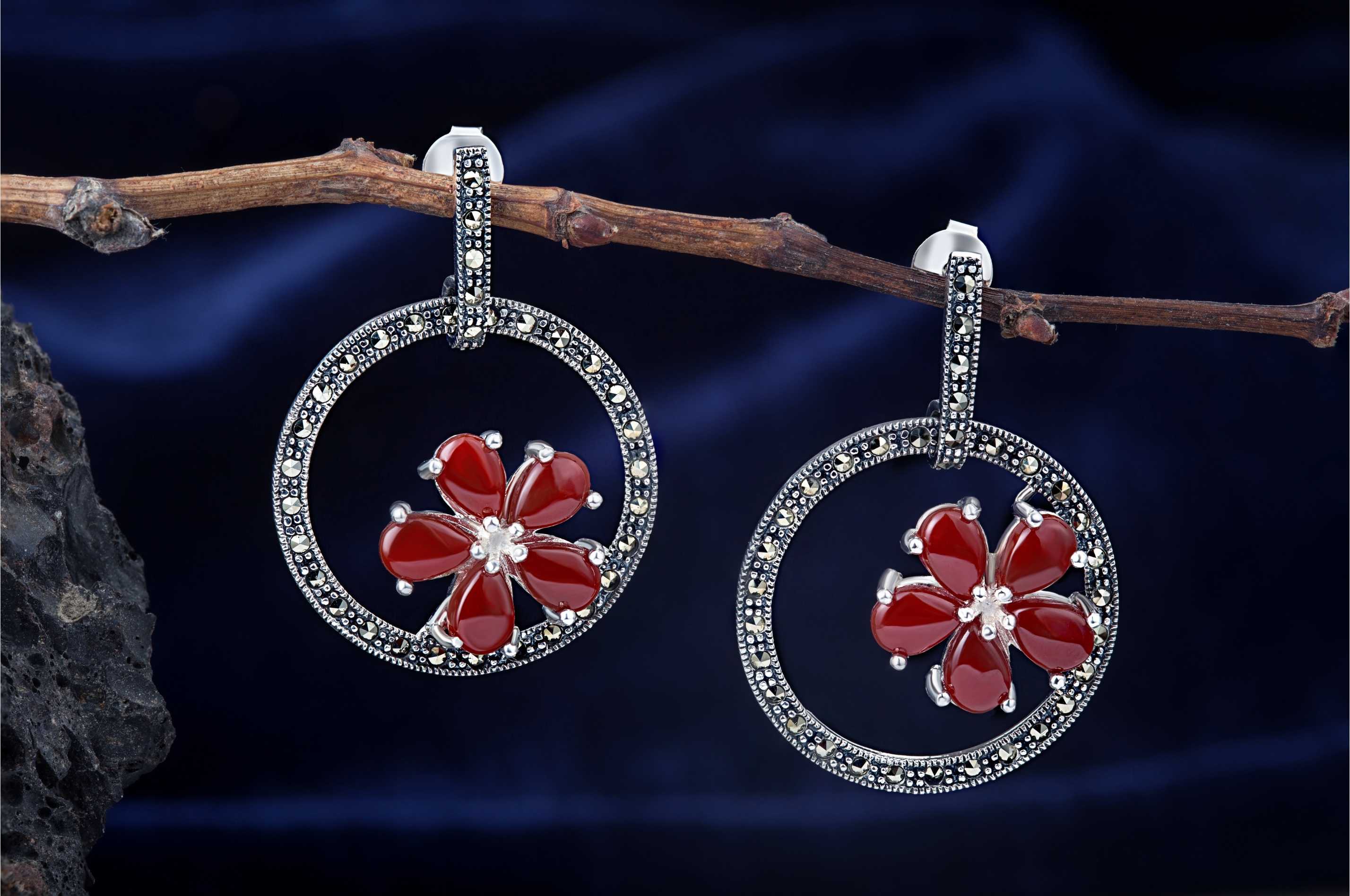 If only the world could be as gentle, tranquil, and beautiful as the carnelian flower. Presenting a pair of dangles with an attractive carnelian blossom in the center of a circular geometric design. As the circle is enriched by marcasite, which acts as an outline to the fascinating carnelian blossom, it appears to be absolute art. With a stunning oxidized silver finish. Handcrafted with 92.5 sterling silver, this piece is sure to turn heads.