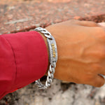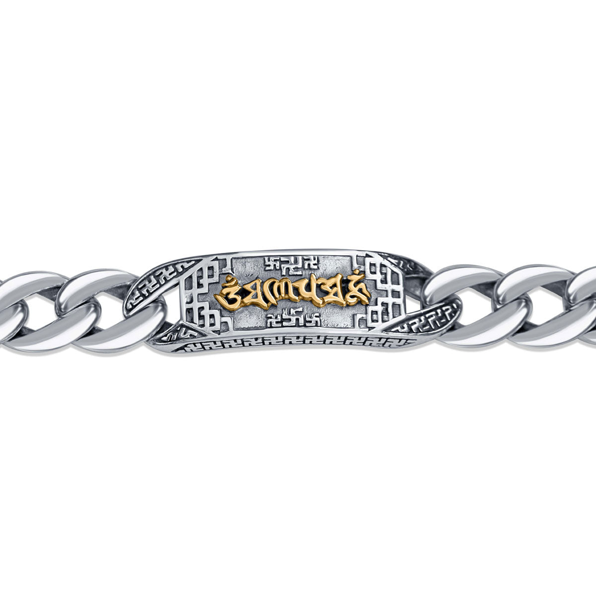 Embody spiritual elegance with this exquisite bracelet, masterfully crafted from 925 sterling silver. The oxidized finish adds a touch of sophistication, while the centrepiece features a powerful mantra in oxidized gold finish, surrounded by symbolic Swastika motifs. The interlinked Figaro chain bracelet complements the centrepiece perfectly, creating a truly unique and meaningful accessory. Whether you're looking for a thoughtful gift for a special man in your life or seeking to elevate your own spiritual style, this bracelet is sure to inspire.