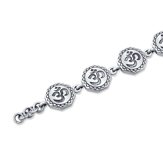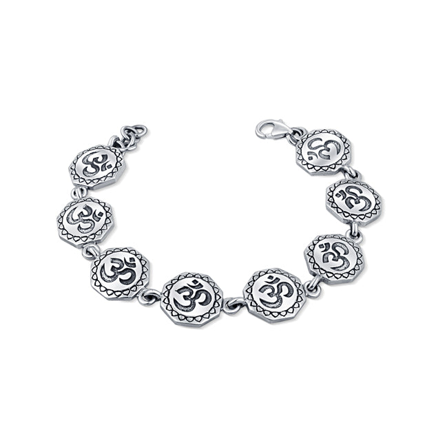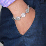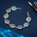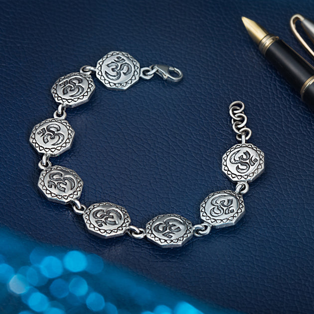 Our Surya Aum Oxidised Silver Bracelet for Men is another style statement from our collection of auspicious symbol ornaments. Made in 92.5 Sterling Silver with a beautiful oxidised silver finish, the bracelet is an interlocked chain with tiny round silver tablets inscribed with Aum inside a sun. Aum is the high vibrational cosmic sound of power, wisdom and prosperity. Sun embodies happiness and life. Our exquisite Surya Aum Oxidised Silver Bracelet for men is the perfect fashion accessory, and a signature ornament for the spiritually empowered men of today. Its high vibrations activate positive energy in the wearer and all around the wearer.