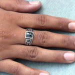 The sides of the ring display a striking interlinked pattern that symbolizes connection, strength, and continuity. Enhanced with oxidised detailing, each link stands out with bold contrast against the polished silver surface. This combination of sharp geometry and rich black tones creates a look that is refined, masculine, and full of character.