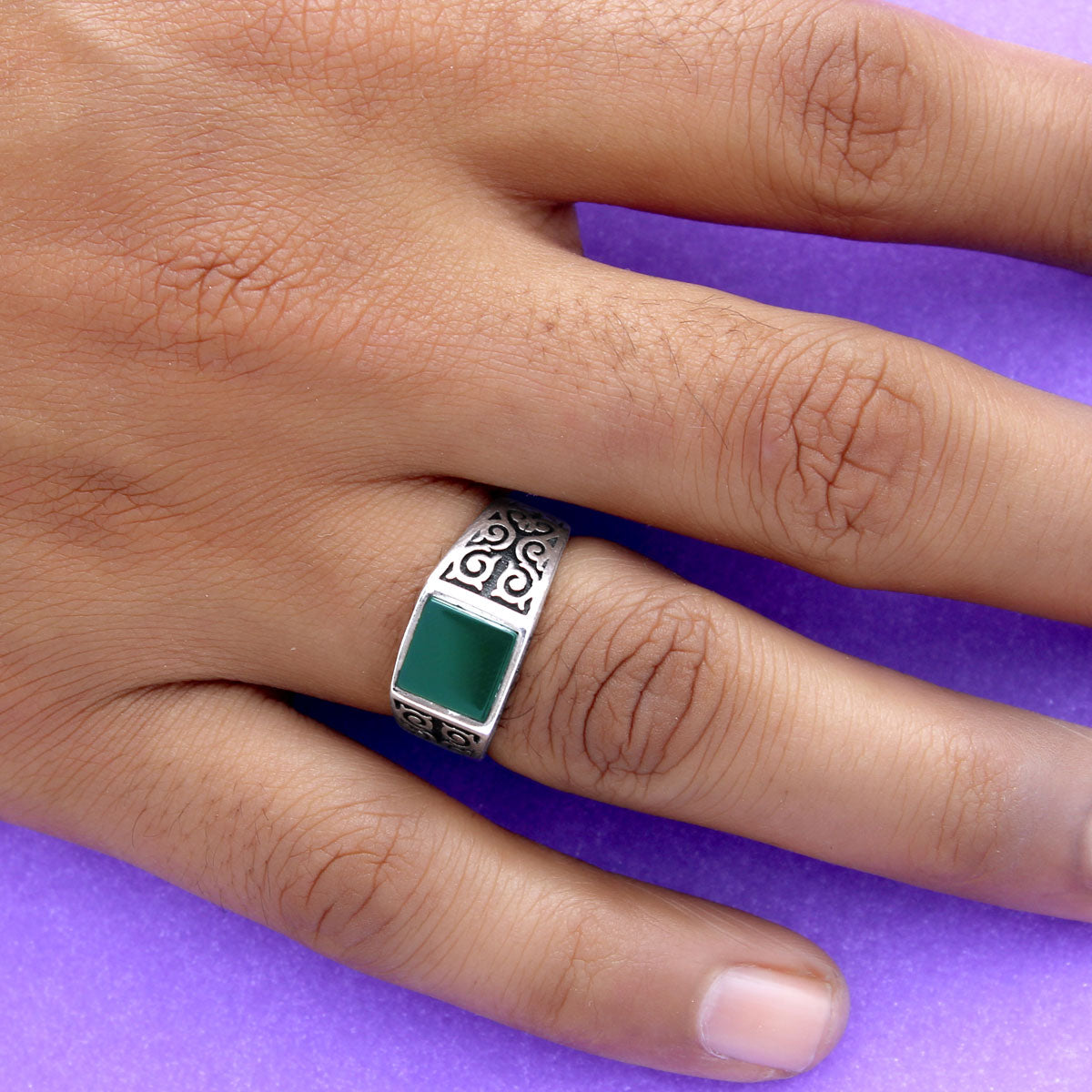 Made in pure 92.5 sterling silver, the ring is durable, skin friendly, and comfortable for everyday wear. The unique combination of raw green onyx and intricate side patterns makes this piece a perfect choice for men who enjoy jewellery that feels meaningful, stylish, and bold.