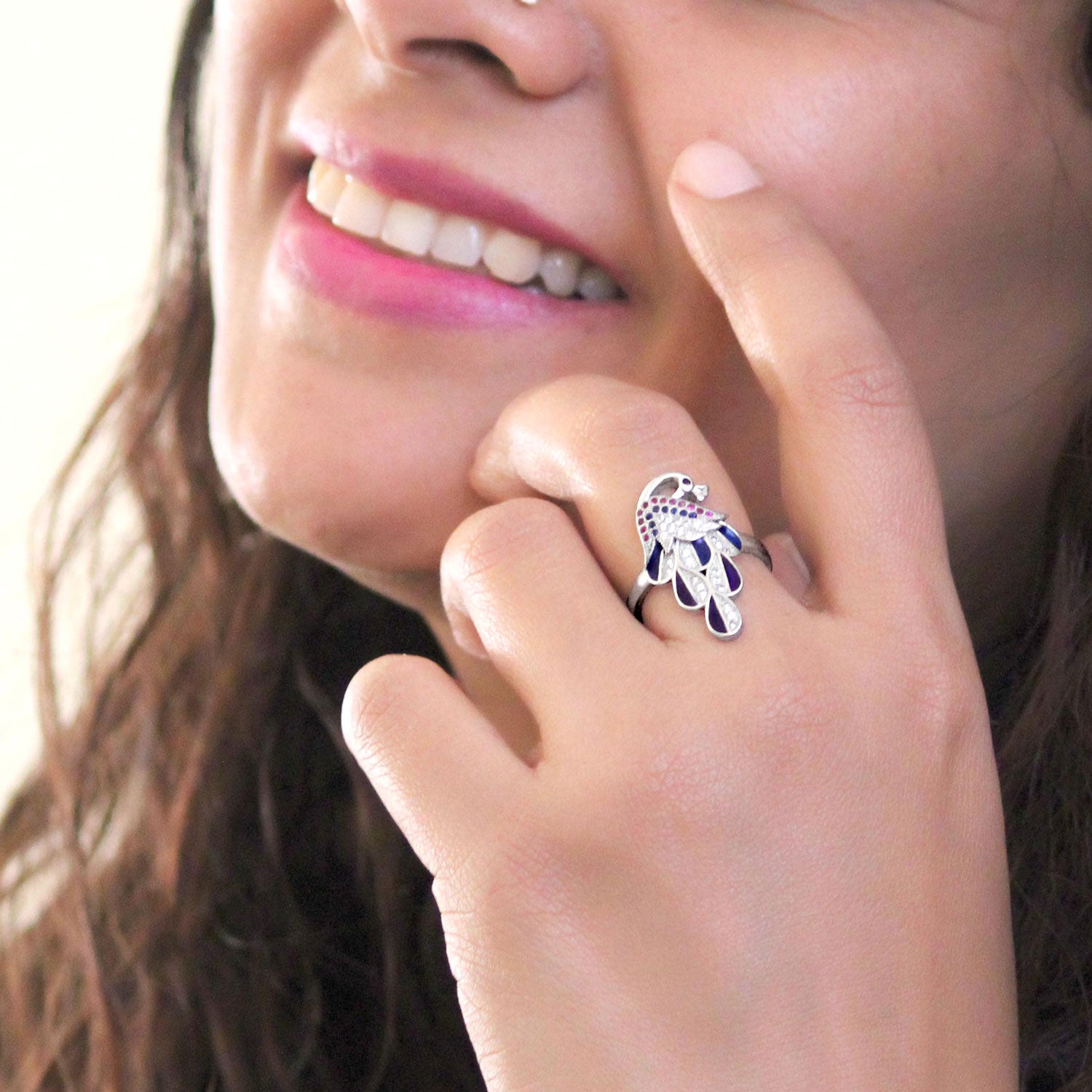 Dancing Peacock Sterling Silver Ring for Women with enamel and zirconia