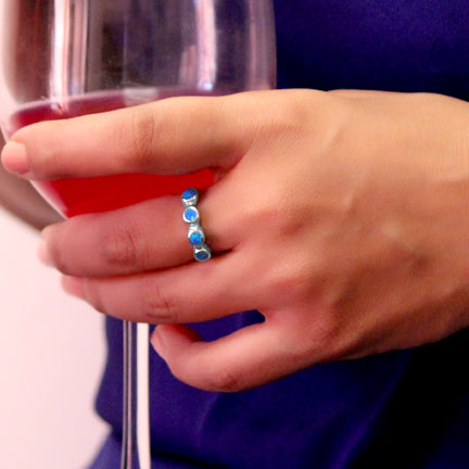 Crafted with sterling silver for an impeccable shine, this Blue Cosmos Sterling Silver Ring- Blue Opal is perfect for a modern goddess. Boasting a beautiful blue Australian opal centerpiece surrounded by twinkling circles, this elegant piece of jewelry is the ideal gift for a loved one. Make a statement and exude sophistication with the Blue Cosmos Sterling Silver Ring- Blue Opal.
