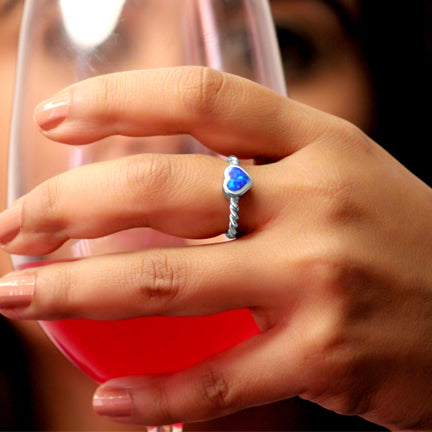 This lovely sterling silver ring for women with the glittering blue Australian opal in a romantic heart shape will add a touch of allure to your look. The twisted rim delicately wraps around the finger for a timeless and beautiful aesthetic. Perfect for any occasion or everyday wear.