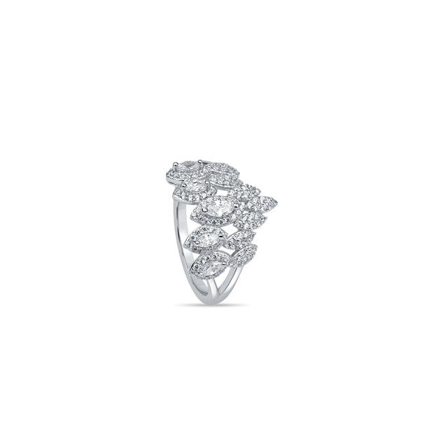 This Simmery Petals Sterling silver Ring for women is a luxurious fashion statement. Elegant petals motif, studded with glimmering zirconias, and finished with a shiny rhodium plating make it the perfect accessory for any occasion. A perfect choice for an elegant and sophisticated look.