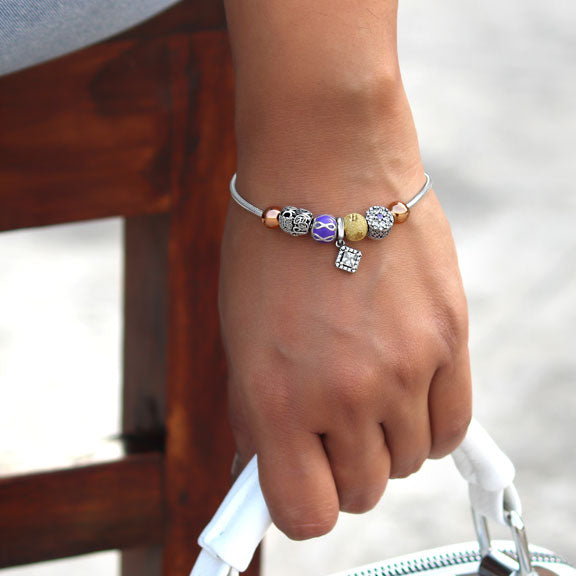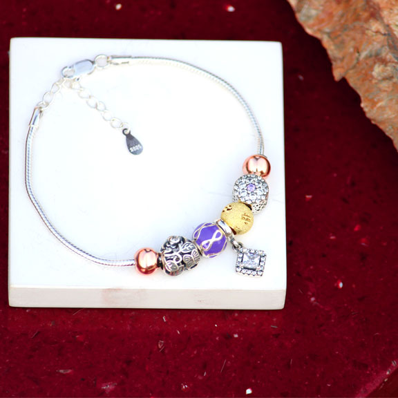 Inspired by the universe, this dainty bracelet is made in 92.5 sterling silver. To create this magnificent piece row of colorful round balls and charms with zirconia are nestled in a rhodium finish chain.
