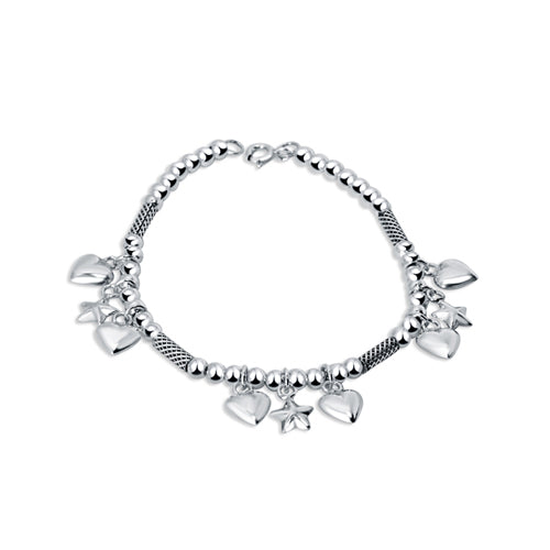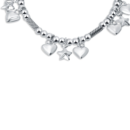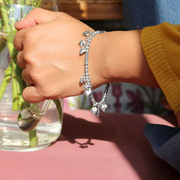 A dreamy delight for all the women out there! The Starry Heart Silver Bracelet is both whimsical and disarmingly beautiful, flowing like a starry night. Crafted in pure 92.5 sterling silver featuring heart and star-shaped elements with an oxidized silver finish to charm your soul. This bracelet is a must-have for any fashionista.