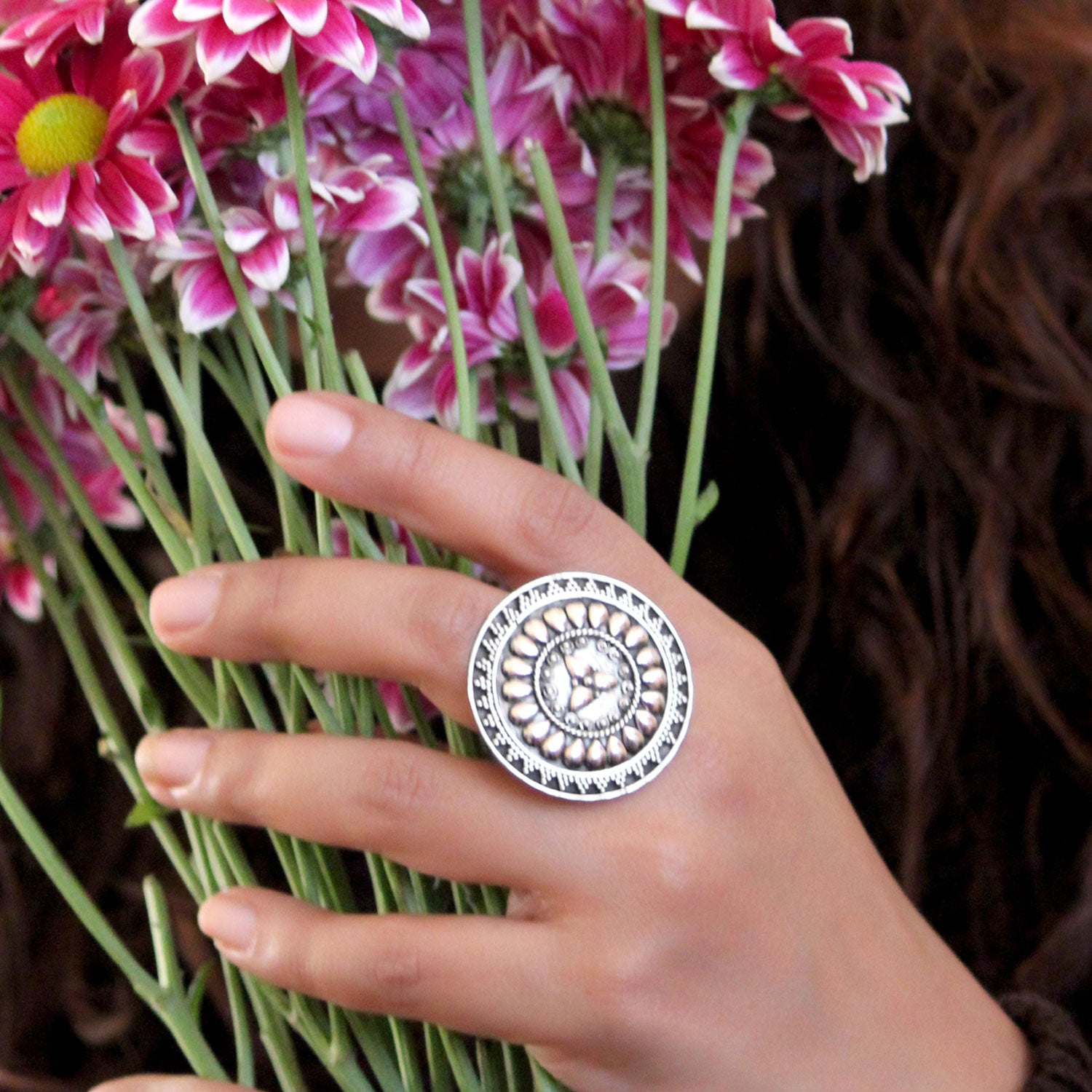Perched in 92.5 sterling silver with oxidised finish, this magical ring holds a sparkling mirror as a centerpiece and carved design all around. You can style it for your everyday look.