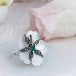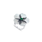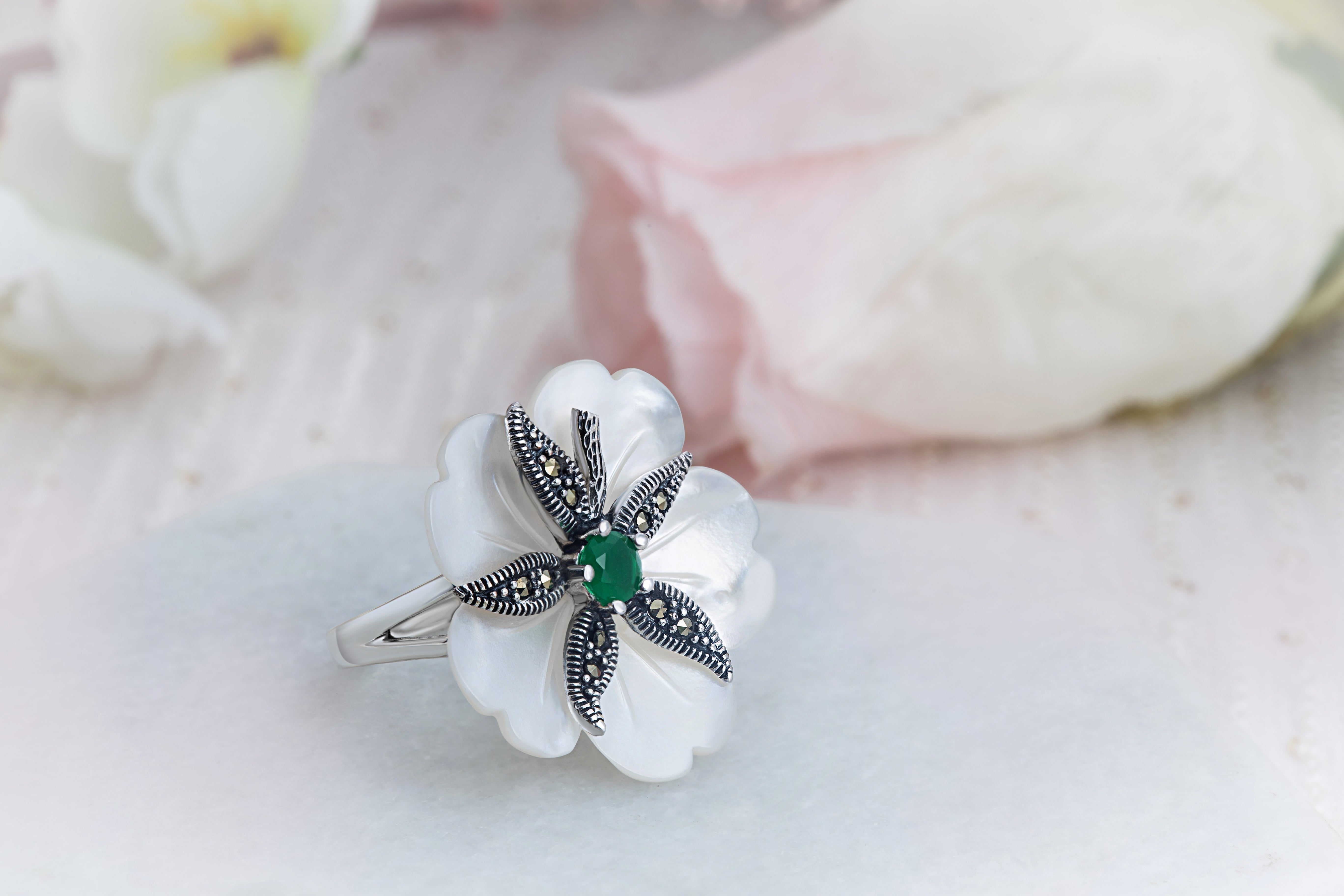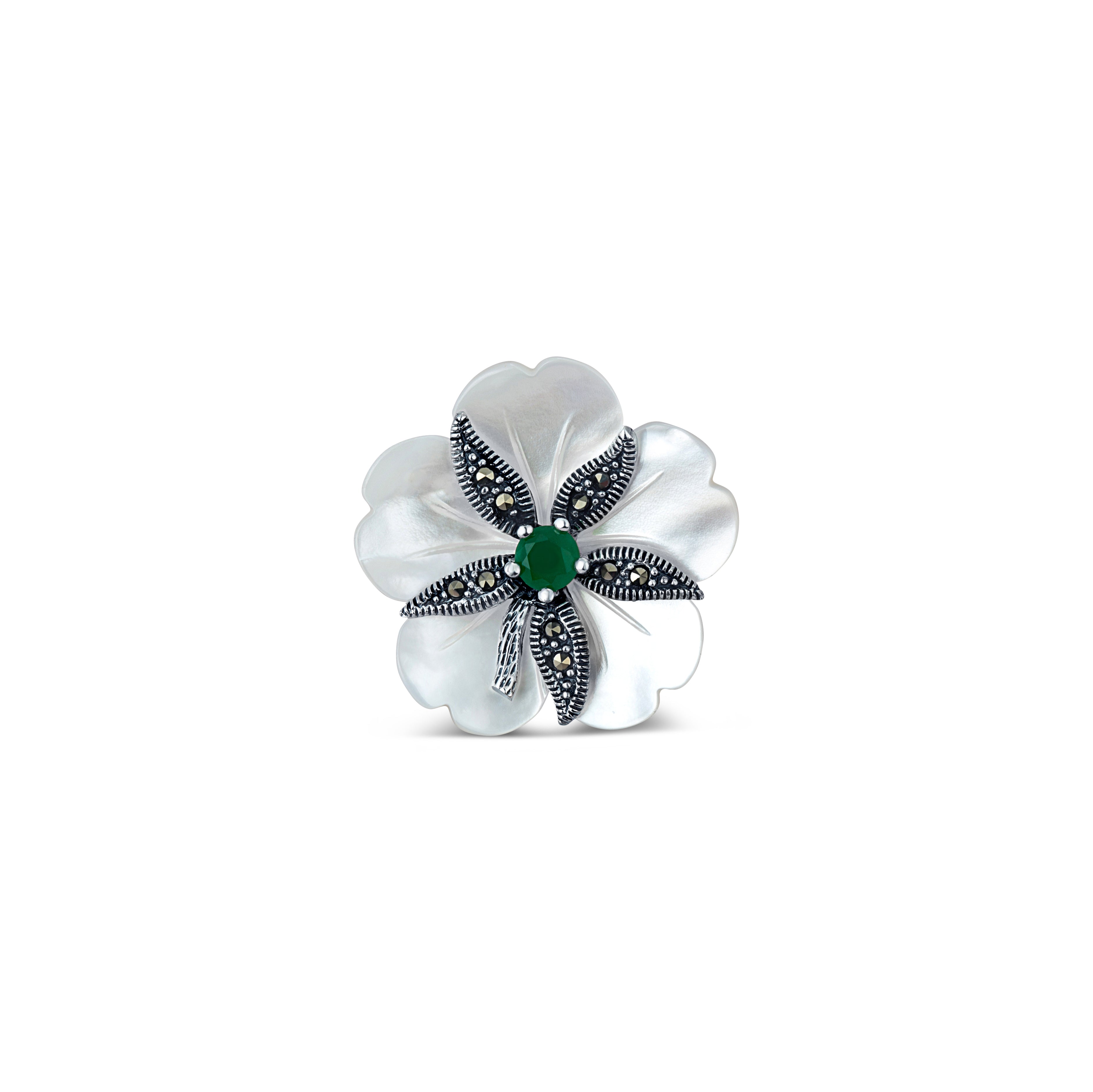 Flowers make everything beautiful! When you get two flowers together everything is as heavenly gorgeous as the cosmos. Detailed with a silver flower handcrafted with mercasite on topping off the graceful blossomed blooms crafted from mother of pearl, with a fascinating core of zirconia. This silver goodie is made from 92.5 sterling silver and has a traditional oxidized tone. This will undoubtedly turn heads your way!