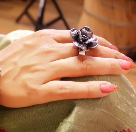Add this quintessential flower ring to your jewelry collection. With its intricate attention and flower motif, this stunning 92.5 sterling silver Pushp flower ring is a sight to behold.