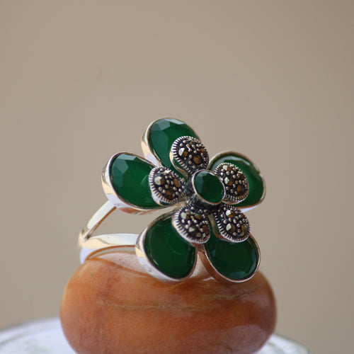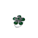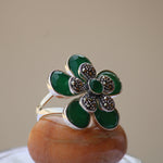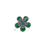 This emerald edition of our beautiful soulmate ring Sayonee is beautifully crafted in hues of heart chakra. Made in 92.5 Sterling Silver, with an oxidised silver finish, our Sayonee Silver Ring for Women with Emerald gemstones is an exquisite piece of floral motif making your aura shine in your beautiful feminine charm. The beautiful emerald green hue embodies abundance and love. The gemstone emerald embodies feminine power. Our Sayonee Silver ring is the perfect song of love to seal your love with.
