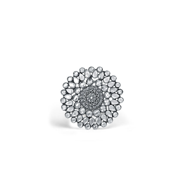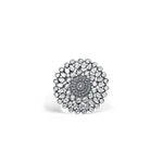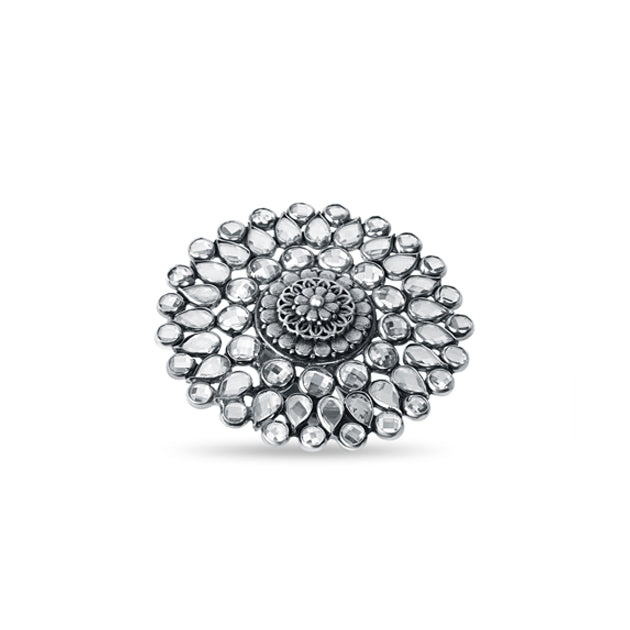 Our Priyam Sterling Silver ring for women is an absolutely gorgeous silver ring with exquisite ornate design. It’s beautiful and bold look is symbolic of the lavish power, grandeur and beauty of Queens. The beautiful flower motif in three radiating lines, and the beautifully crafted silver flower in the centre exudes feminine charm and mystery. At the same time, the bold size of the ring adds sensuality and power to it. The adjustable closure makes it a perfect fit for all sizes. Made in 92.5 Sterling Silver with oxidised silver finish, our Priyam silver ring is the perfect silver ornament to honour traditional festivities, wedding rituals and pooja ceremonies. It is a perfect accompaniment to your traditional zaris, brocades and gorgeous ethnic ensembles.