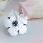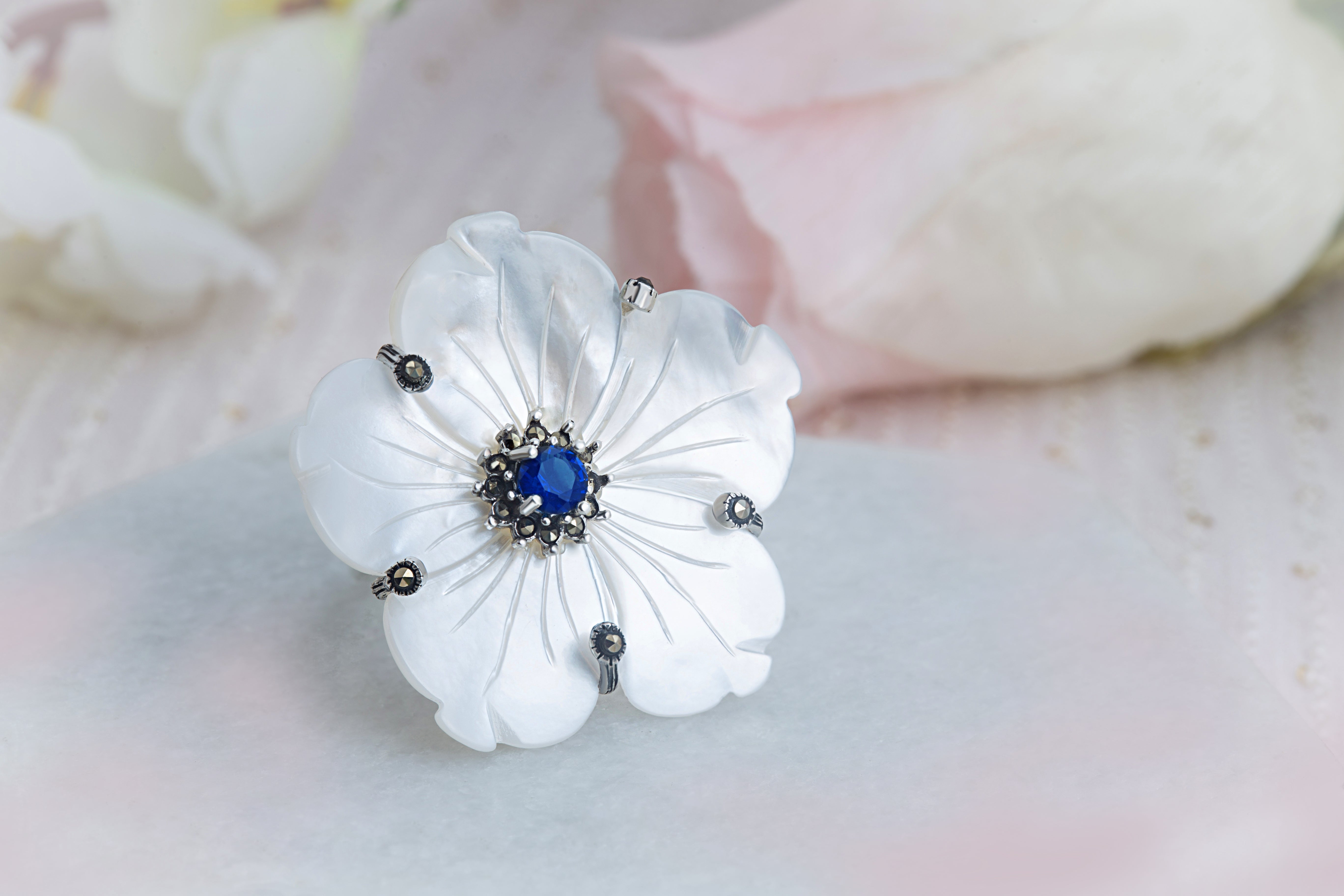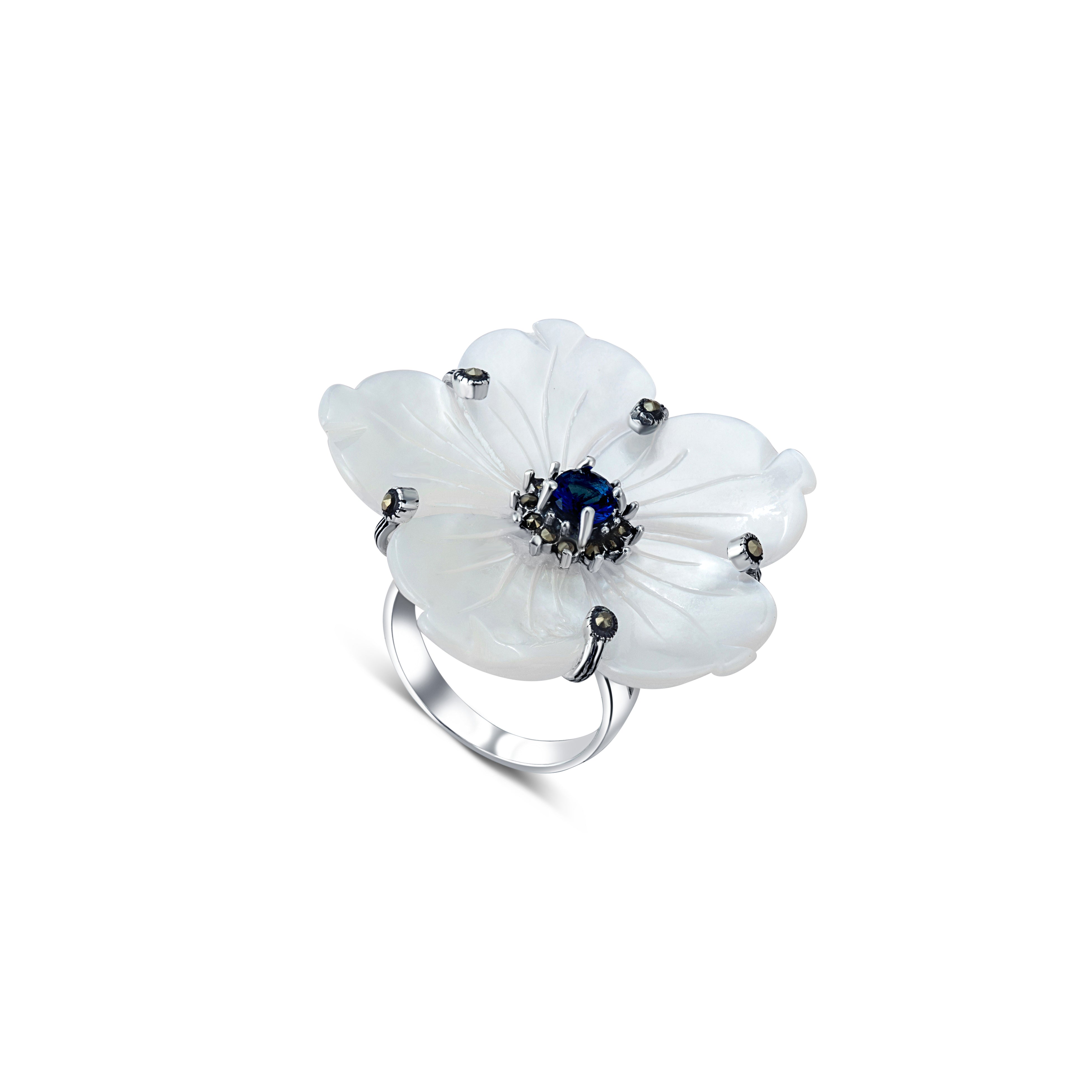 Looks like a snowflake and has the star in the heart with the glitter on each petal this sada bahar ring is an out-of-the-world ring. The handcrafted flower ring is a replica of Vinca with the zirconia in the center, bloomed petals are crafted from mother of pearl whereas each petal has a mercasite on it that shines illusionary and have ravishing oxidized silver. Enrich with 92.5 sterling silver this is the most precious ring that one may acquire.