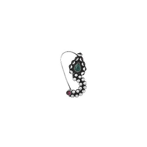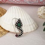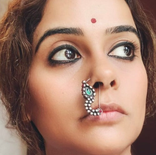 Inspired by nature and floral elements, a big paisley shape studded with green stones is on one side of the nath and the other side end with a beautiful pink color stone. This is a perfect blend of contemporary design with traditional Maharashtrian "Nath".