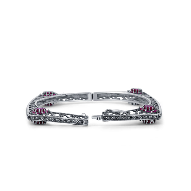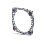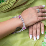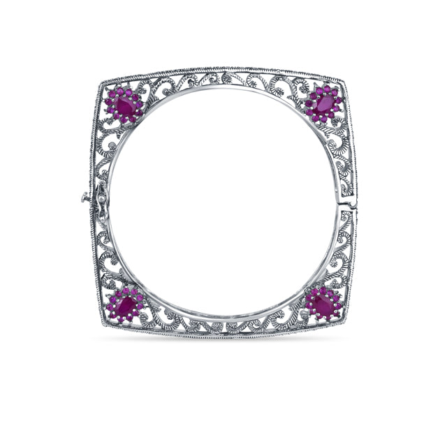 Kada or a thick bangle has always been a very popular ornament with women. In fact, bangles are unique to Indian fashion. Ethnic ensemble is just not complete without adding the fashion signature of bangles and kadas. Kada is a very unique jewellery that stands out with its power aura. Our Mayara Square Silver Kada for Women is a very stylish fashion accessory. It’s square shape makes it very eye-catching, and gives it a bold modern charm. Studded with Ruby on four corners, and intricately carved, our Mayara Square Silver Kada is made of 92.5 Sterling Silver and has an oxidised silver finish. Its delicate carving and square shape make it a perfect match for all occasions, from formal weddings to light festivities and gatherings. Let the beautiful and powerful woman in you make her presence felt with this gorgeous ruby studded and oxidised silver kada, Mayara.