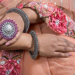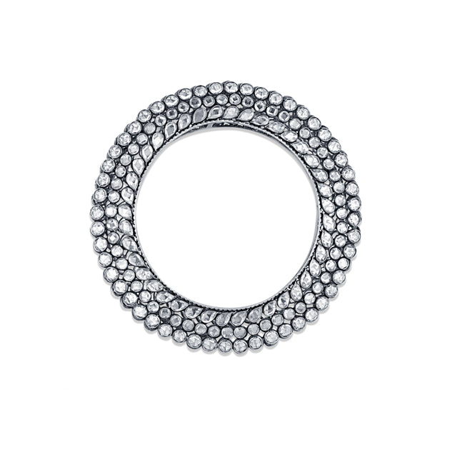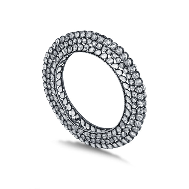 Our Noor Silver Kada for Women is absolutely a spectacular Silver saga that you simply must add to your exquisite jewellery collection. Noor, the word means divine light. This beautiful piece of wrist jewellery is exquisitely crafted in three radiating lines of ornate silver rings, embodying the concept of light radiating. It is set in 92.5 Sterling Silver with oxidised silver finish. Its powerful chakra design is sure to fire up the occasion with its sheer majestic aura. A jewellery designed for Queens and Princesses and women of substance, our Noor Silver Kada pays a bold tribute to the powerful sensuality and beauty called Woman. This extravagant and bold silver ornament is tailor made for special occasions like wedding functions, puja rituals and grand festivities. Those traditional attires, heavy brocade lehengas and sarees, lavish zari, embellished chiffon, embroidered suits, delicate shararas, glittering dupattas, kaajal lined eyes, tantalising jhumkas, they just cannot go without our Noor Silver Kada. A single Noor kada is all you need to add the royal allure to your ensemble.