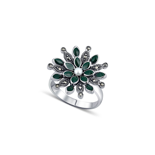This exquisite Blooming Green Flower Ring crafted in 925 sterling silver, adds a delightful touch of elegance to any ensemble, combining whimsy and style for a truly stunning look. Its lush petals crafted from gleaming green Onyx and Maracsite stones, promise to make any outfit bloom with vibrant beauty. For a timeless look of sophistication and grace, nothing quite measures up to this sublime piece of jewellery.