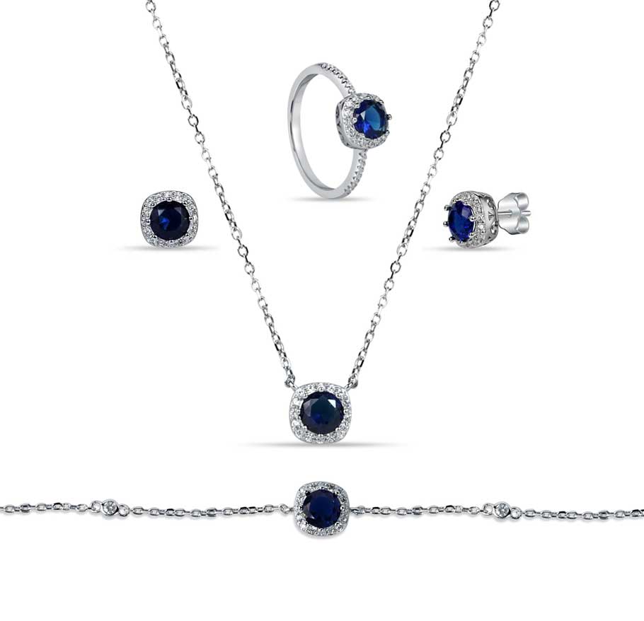 Unleash your inner glam with our 925 sterling silver 4-piece set. Featuring a bracelet, ring, necklace, and stud earring, this rhodium-finished set boasts a striking blue zirconia as its centerpiece, surrounded by dazzling smaller zirconia. Perfect for a minimal yet magnificent look all day, it's also a fabulous gift for her. Shine on! (Perfect for any occasion!