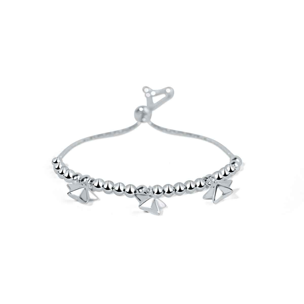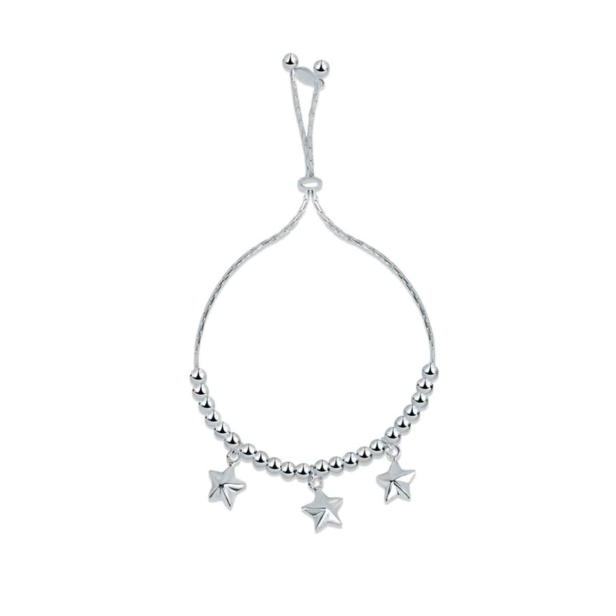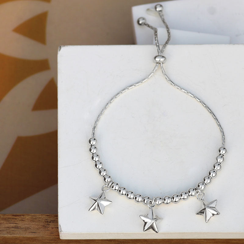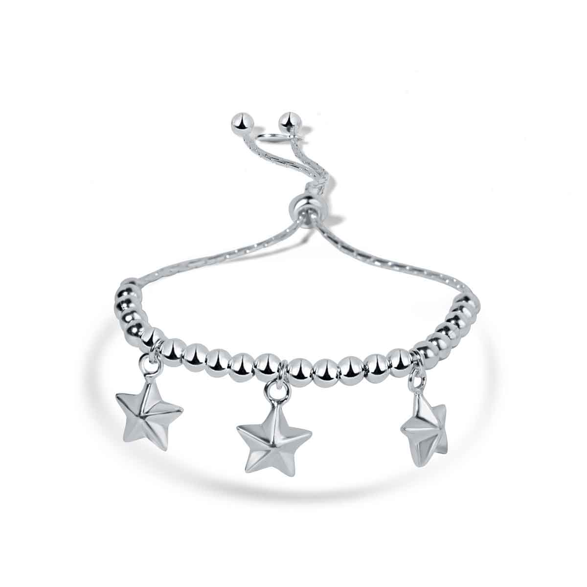 Indulge in luxury with the Deewane Sitaare sterling silver bracelet. This silver-finished bracelet boasts a delicate design featuring 3 stars and round balls. Perfect for all-day wear, it adds a touch of sophistication to any outfit. The ideal gift for any occasion.