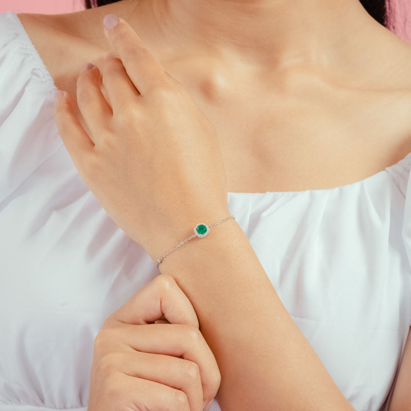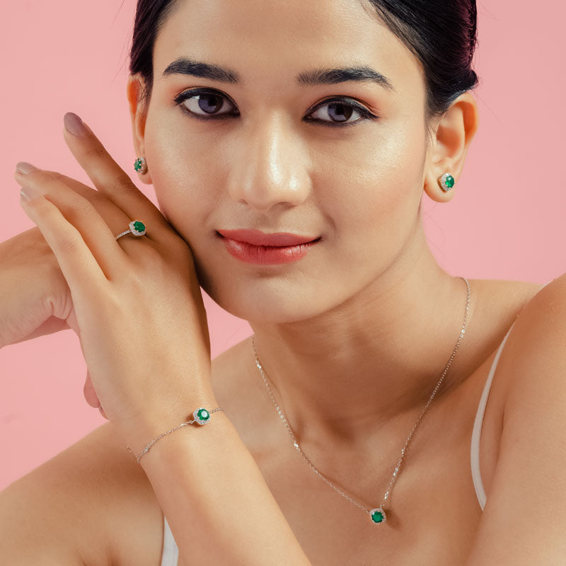 Unleash your inner glam with our 925 sterling silver 4-piece set. Featuring a bracelet, ring, necklace, and stud earring, this rhodium-finished set boasts a striking green zirconia as its centerpiece, surrounded by dazzling smaller zirconia. Perfect for a minimal yet magnificent look all day, it's also a fabulous gift for her. Shine on! (Perfect for any occasion)!