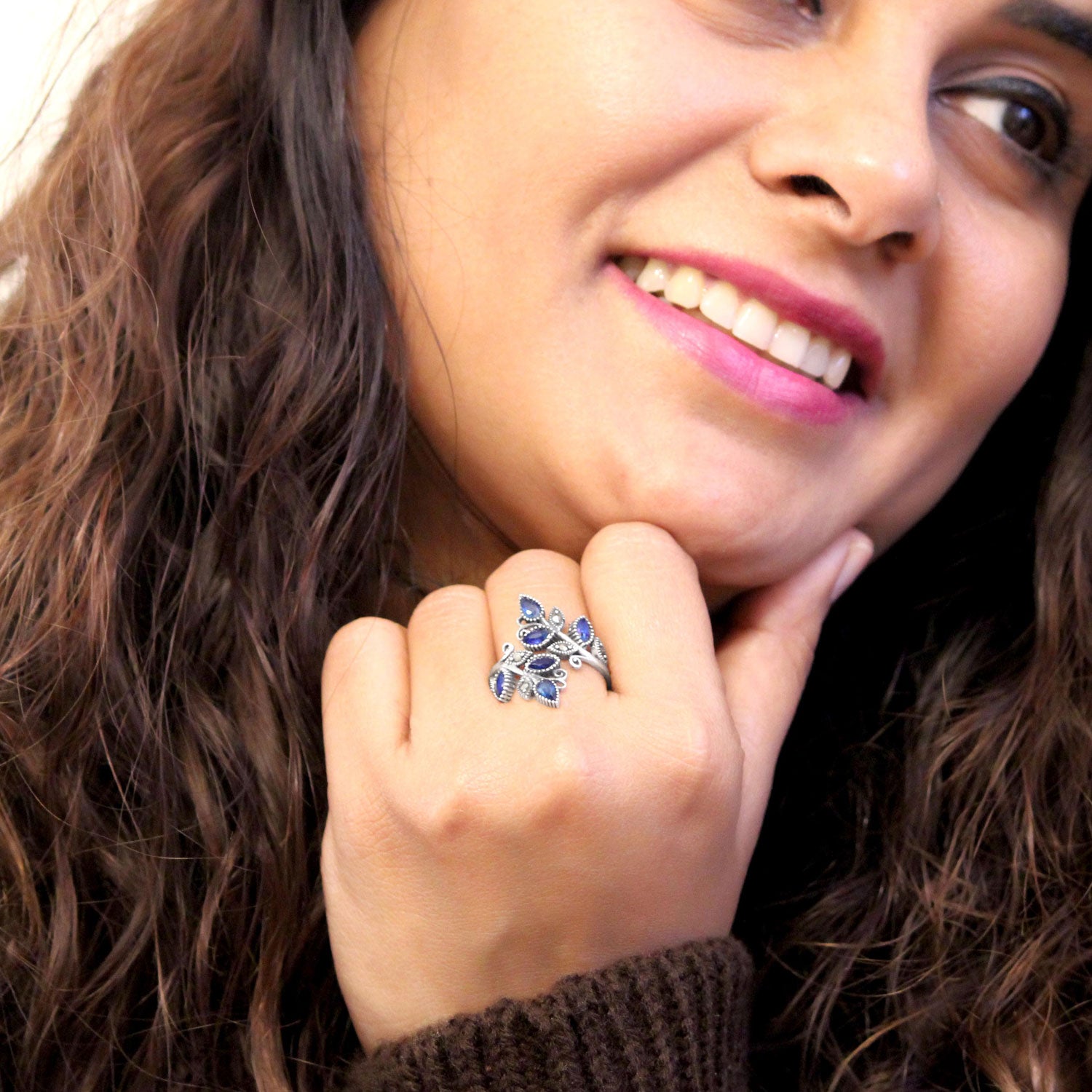 stunning leaf motif adorned with marcasite. The blue sapphire stone adds a