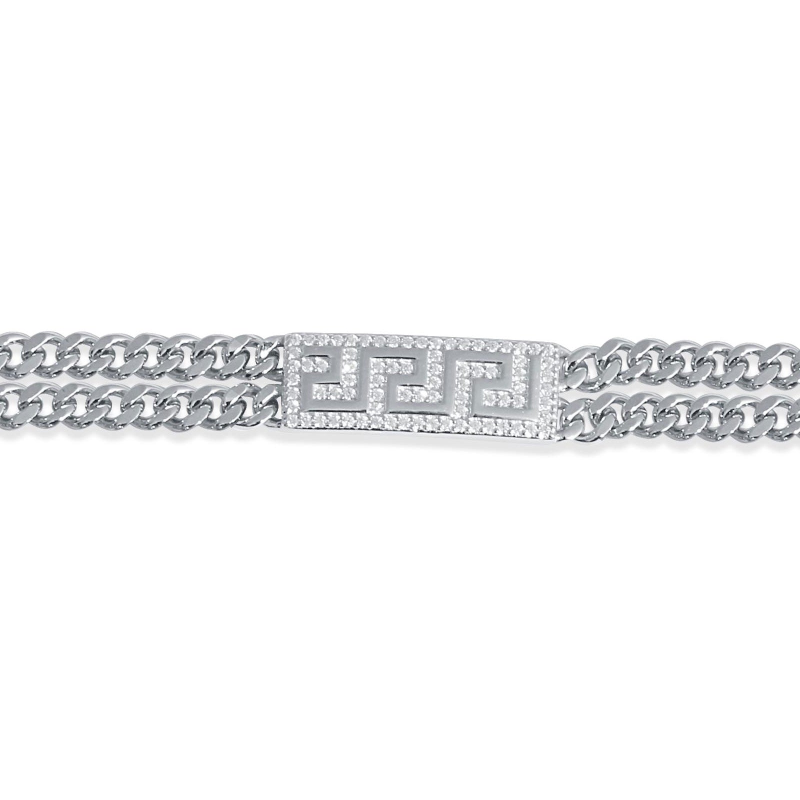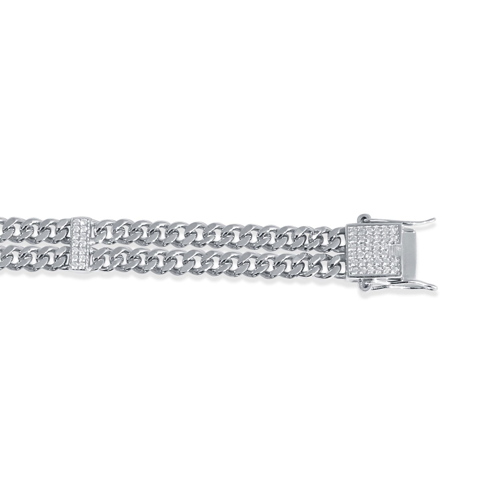 Designed with dual interlinked silver chains, the bracelet delivers a strong masculine presence while ensuring flexibility and comfort for everyday wear. Additional zirconia studded accents along the chain enhance its premium appeal and create a seamless flow from clasp to centerpiece.
