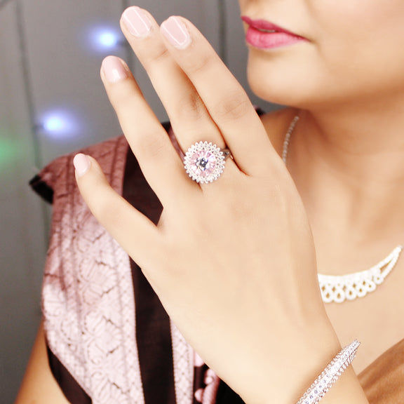Bring a dazzle of color and luxe to your outfit. Let this zirconia studded 92.5 sterling silver ring creates an elegant look effortlessly. The sparkling pink zirconias are surrounded by clear zirconias that steal attention. This rhodium finish ring is a showstopper that brings shine and light for a sleek look.