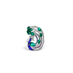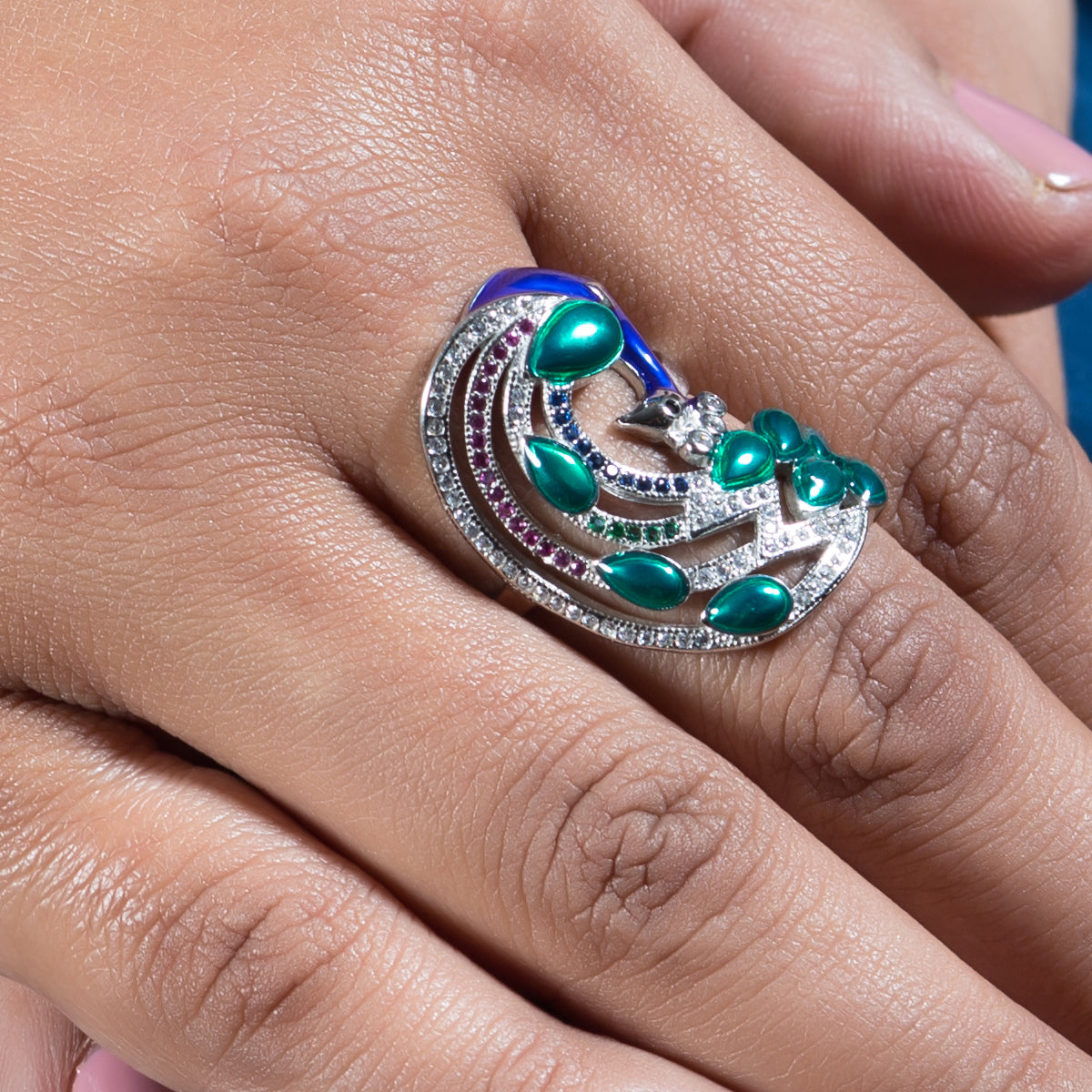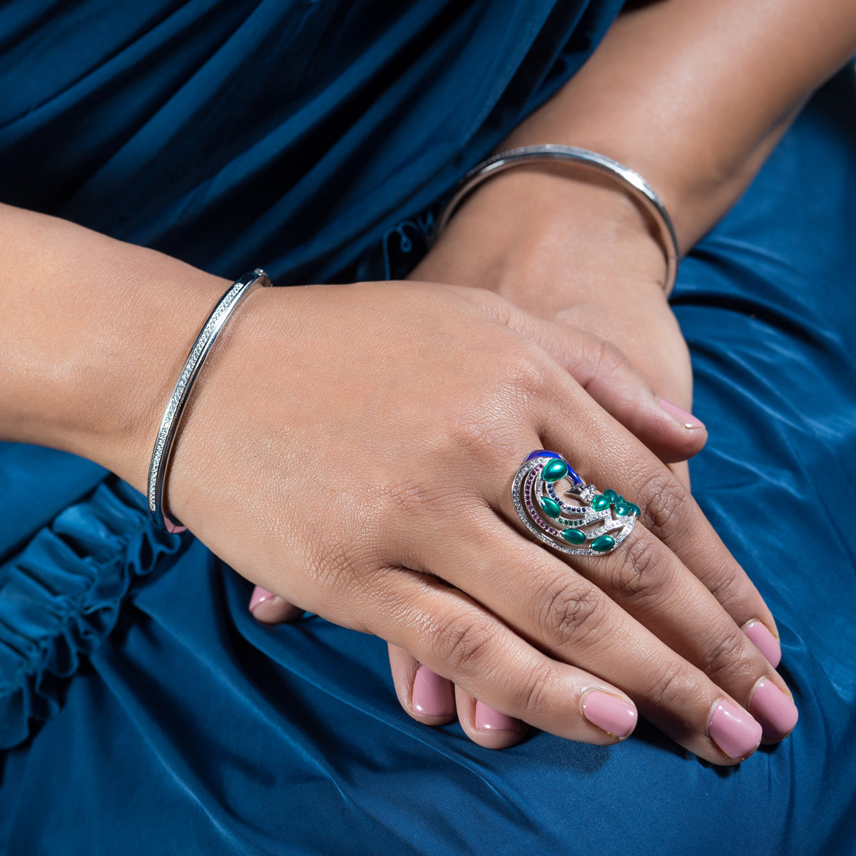 Morni is a peahen. Our beautifully crafted green enamel Morni Silver Ring for women, in 92.5 Sterling Silver is a delicate ornate peahen motif. The vibrant green enamel embellishment enhances its ethnic charm. The exquisite zirconias studded contours and blue enamelled slender neck add to the charming vibrant feminine aura of the Morni Silver ring. Its colourful ethnic look makes it a perfect jewellery accessory for traditional festivities, ceremonies, and for casual get-togethers. It’s simple elegance and glamorous Rhodium finish gives it a universal appeal that goes with all occasions and all fashion styles. Let your vibrant femininity shine through our Morni zirconia studded Silver Ring.